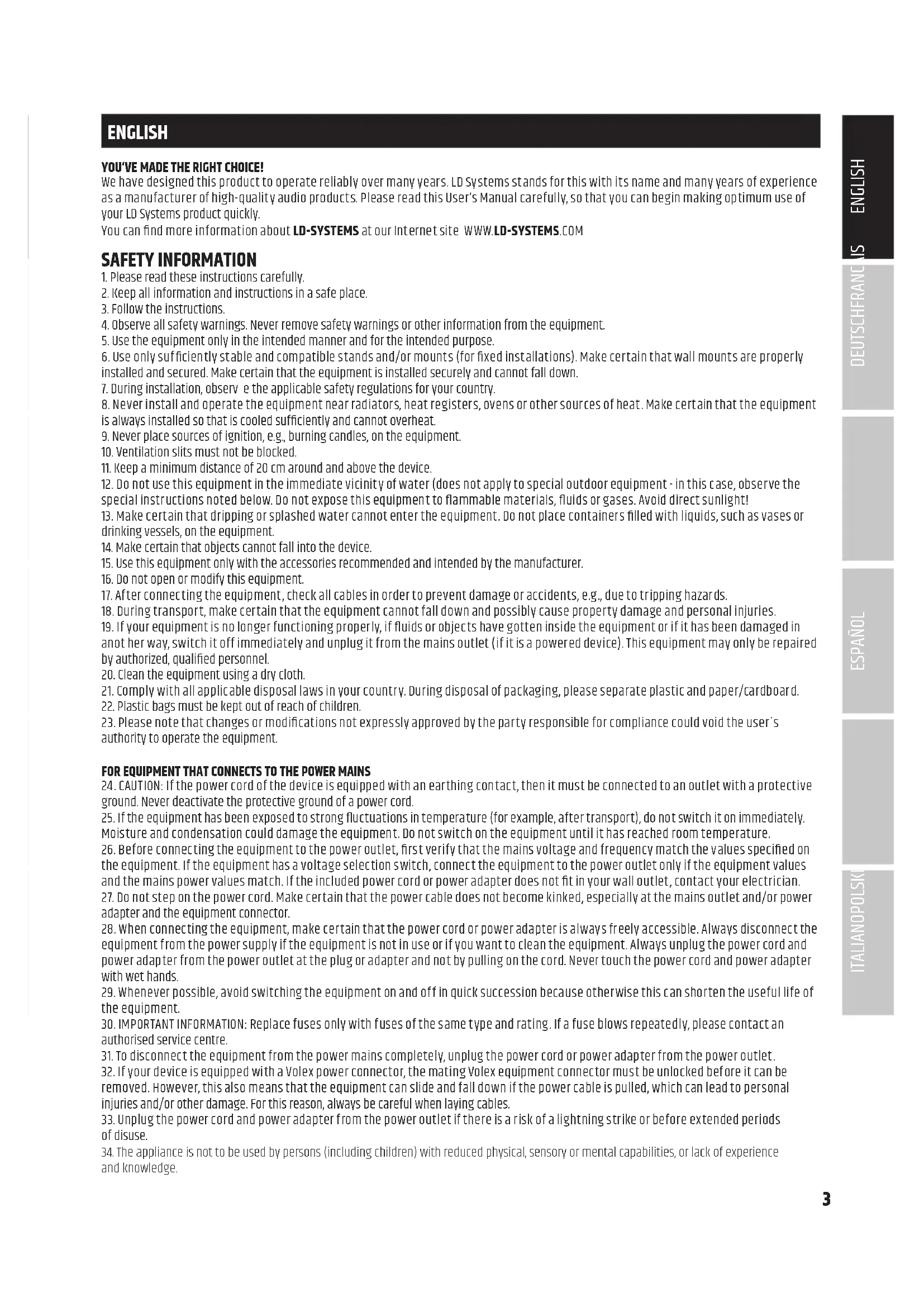 YOU‘VE MADE THE RIGHT CHOICE! We have designed this product to operate reliably over many years. LD Systems stands for this with its name and many years of experience as a manufacturer of high-quality audio products. Please read this User‘s Manual carefully, so that you can begin making optimum use of your LD Systems product quickly. You can nd more information about LD-SYSTEMS at our Internet site WWW.LD-SYSTEMS.COM SAFETY INFORMATION
