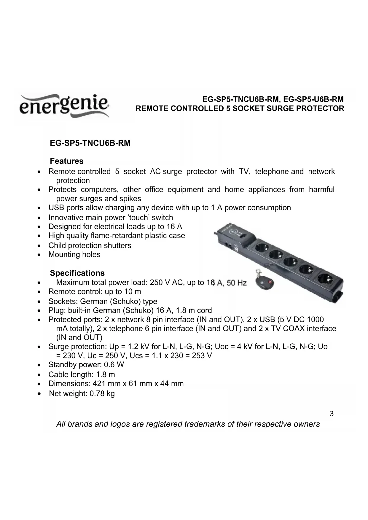 All brands and logos are registered trademarks of their respective owners EG-SP5-U6B-RM Features 5 socket AC surge protector with remote control Protects computers, other office equipment and home appliances from harmful power surges and spikes USB ports allow charging any device with up to 2 A power consumption Designed for electrical loads up to 16 A High quality flame-retardant plastic case Child protection shutters Mounting holes Specifications Maximum total power load: 250 V AC, up to 16 A, 50 Hz Remote control: up to 10 m Sockets: German (Schuko) type Plug: built-in German (Schuko) 16 A, 1.8 m cord USB ports: 2 pcs, 5 V DC, total current up to 2 A Surge protection: Up = 1.2 kV for L-N, L-G, N-G; Uoc = 4 kV for L-N, L-G, N-G; Uo = 230 V, Uc = 250 V, Ucs = 1.1 x 230 = 253 V Standby power: 0.6 W Cable length: 1.8 m Dimensions: 421 mm x 61 mm x 44 mm Net weight: 0.73 kg5