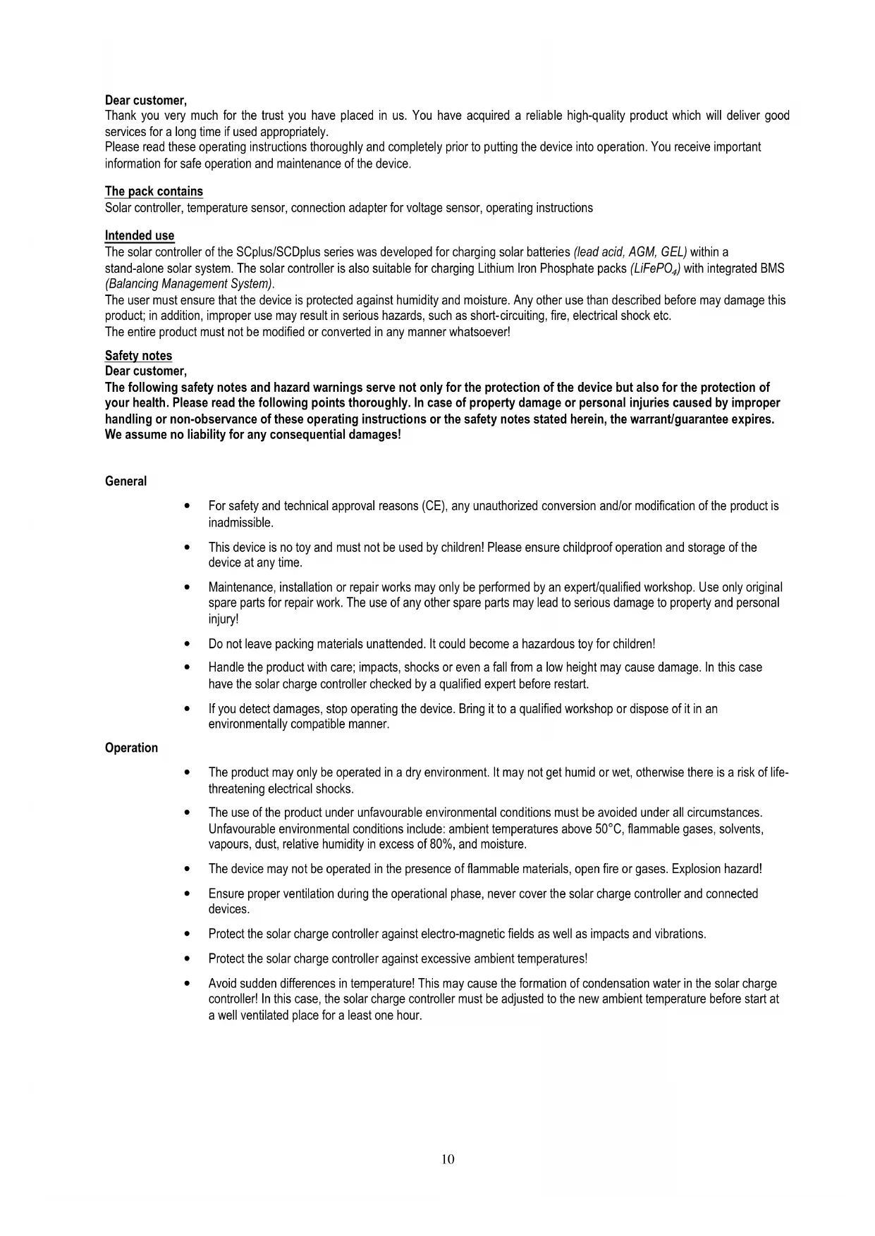 Dear customer, Thank you very much for the trust you have placed in us. You have acquired a reliable high-quality product which will deliver good services for a long time if used appropriately. Please read these operating instructions thoroughly and completely prior to putting the device into operation. You receive important information for safe operation and maintenance of the device. The pack contains Solar controller, temperature sensor, connection adapter for voltage sensor, operating instructions Intended use The solar controller of the SCplus/SCDplus series was developed for charging solar batteries (lead acid, AGM, GEL) within a stand-alone solar system. The solar controller is also suitable for charging Lithium Iron Phosphate packs (LiFePO