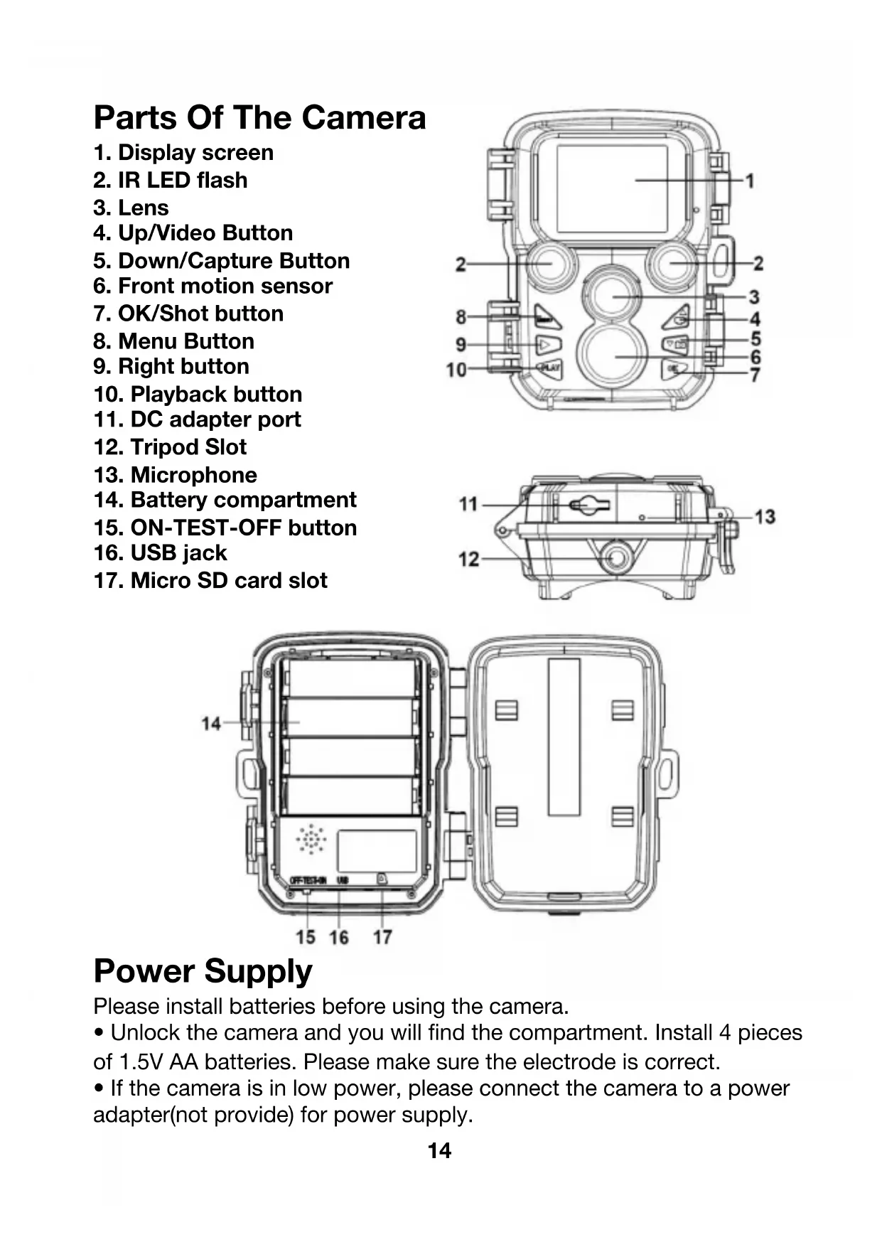 - If the camera is in low power, please connect the camera to a power adapter(not provide) for power supply.15 Inserting The Memory Card Please prepare a Micro SD card and insert it into the camera for saving files. Before recording, please format the memory card first.