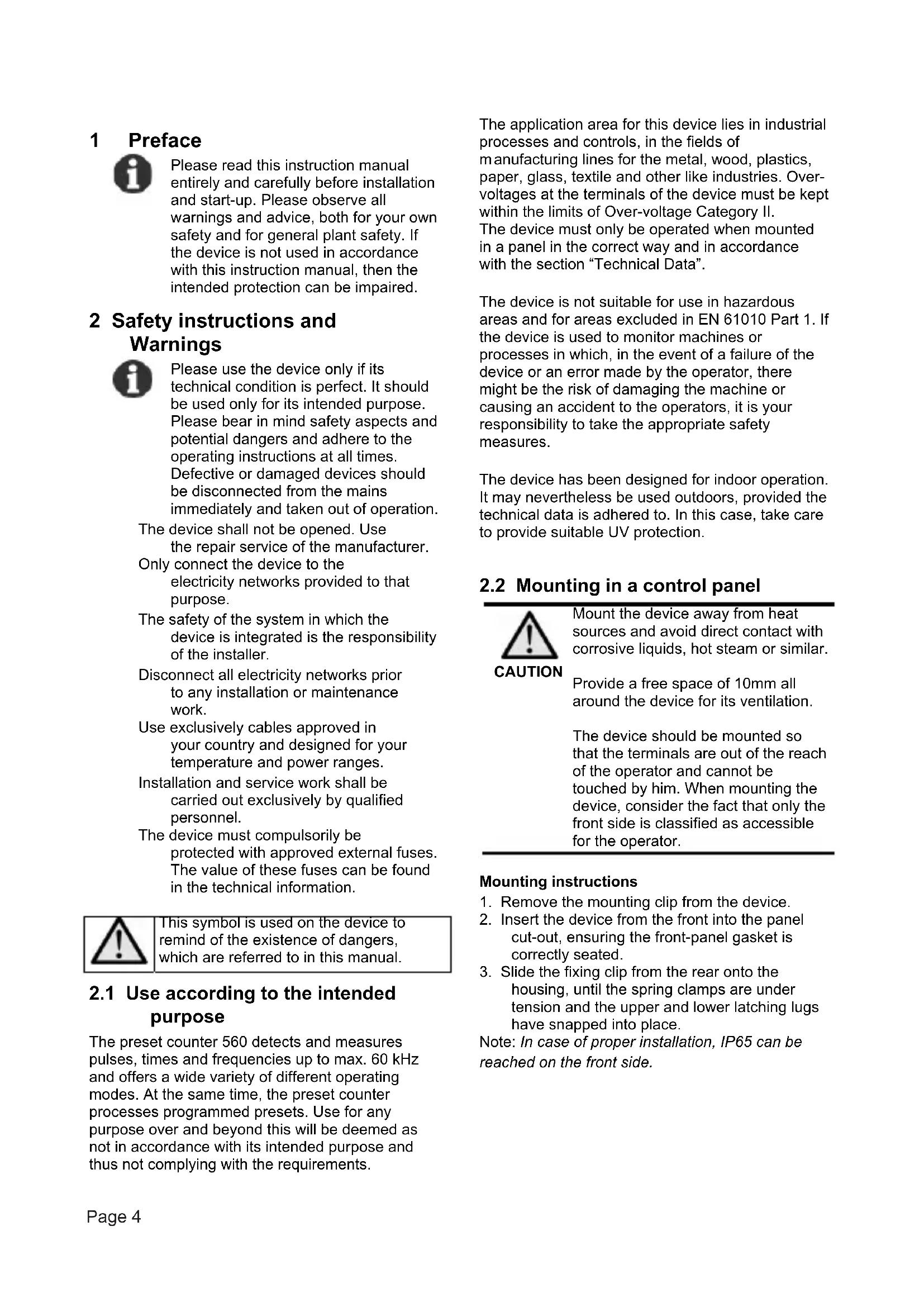 purpose The preset counter 560 detects and measures pulses, times and frequencies up to max. 60 kHz and offers a wide variety of different operating modes. At the same time, the preset counter processes programmed presets. Use for any purpose over and beyond this will be deemed as not in accordance with its intended purpose and thus not complying with the requirements. The application area for this device lies in industrial processes and controls, in the fields of