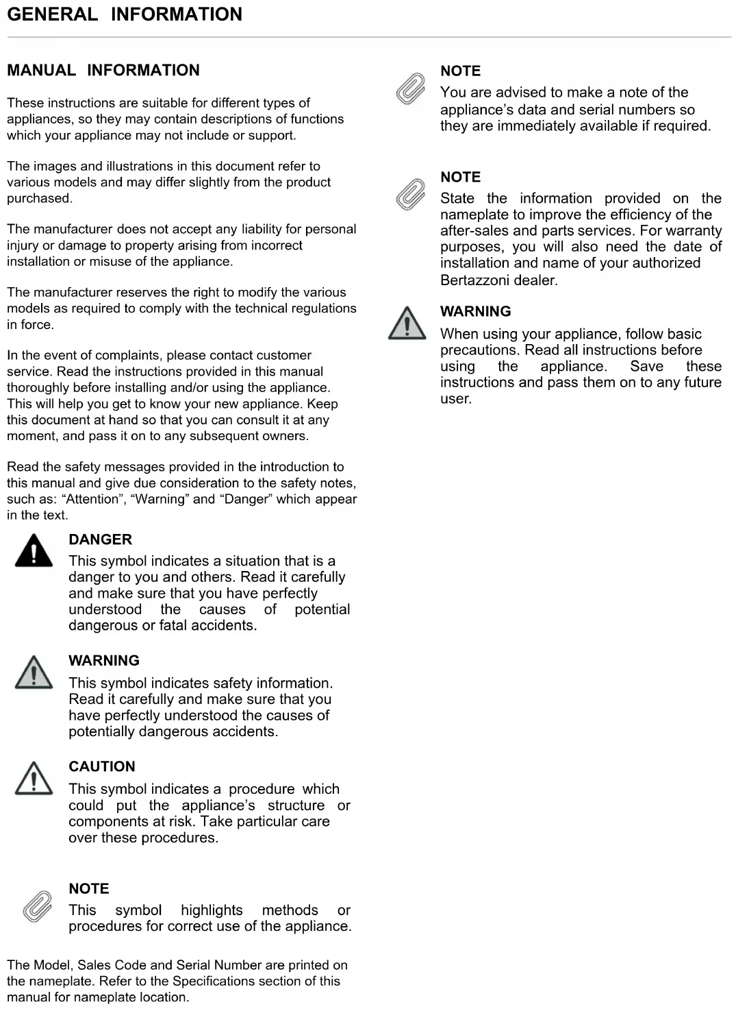 - CONTENTS INSTALLING THE LATERAL AND UPPER TRIMS GENERAL INFORMATION MANUAL INFORMATION These instructions are suitable for different types of appliances, so they may contain descriptions of functions which your appliance may not include or support. The images and illustrations in this document refer to various models and may differ slightly from the product purchased. The manufacturer does not accept any liability for personal injury or damage to property arising from incorrect installation or misuse of the appliance. The manufacturer reserves the right to modify the various models as required to comply with the technical regulations in force. In the event of complaints, please contact customer service. Read the instructions provided in this manual thoroughly before installing and/or using the appliance. This will help you get to know your new appliance. Keep this document at hand so that you can consult it at any moment, and pass it on to any subsequent owners. Read the safety messages provided in the introduction to this manual and give due consideration to the safety notes, such as: “Attention”, “Warning” and “Danger” which appear in the text. DANGER This symbol indicates a situation that is a danger to you and others. Read it carefully and make sure that you have perfectly understood the causes of potential dangerous or fatal accidents. WARNING This symbol indicates safety information. Read it carefully and make sure that you have perfectly understood the causes of potentially dangerous accidents. CAUTION This symbol indicates a procedure which could put the appliance’s structure or components at risk. Take particular care over these procedures. NOTE This symbol highlights methods or procedures for correct use of the appliance. The Model, Sales Code and Serial Number are printed on the nameplate. Refer to the Specifications section of this manual for nameplate location. NOTE You are advised to make a note of the appliance’s data and serial numbers so they are immediately available if required. NOTE State the information provided on the nameplate to improve the efficiency of the after-sales and parts services. For warranty purposes, you will also need the date of installation and name of your authorized Bertazzoni dealer. WARNING When using your appliance, follow basic precautions. Read all instructions before using the appliance. Save these instructions and pass them on to any future user. 9GENERAL INFORMATION SAFETY INFORMATION WARNING This installation manual is intended to aid installation teams. The User Manual provided with the product must also be taken into account. You may be seriously injured and your product damaged if you ignore the warnings provided in this manual. Please read the following carefully. WARNING R600a refrigerant This product contains R600a isobutane refrigerant, which is a very eco-friendly natural gas. However, it is also flammable. If the product has been transported horizontally, you must wait for a minimum of 4 hours before plugging it in. The following instructions must be followed during installation: p. 758