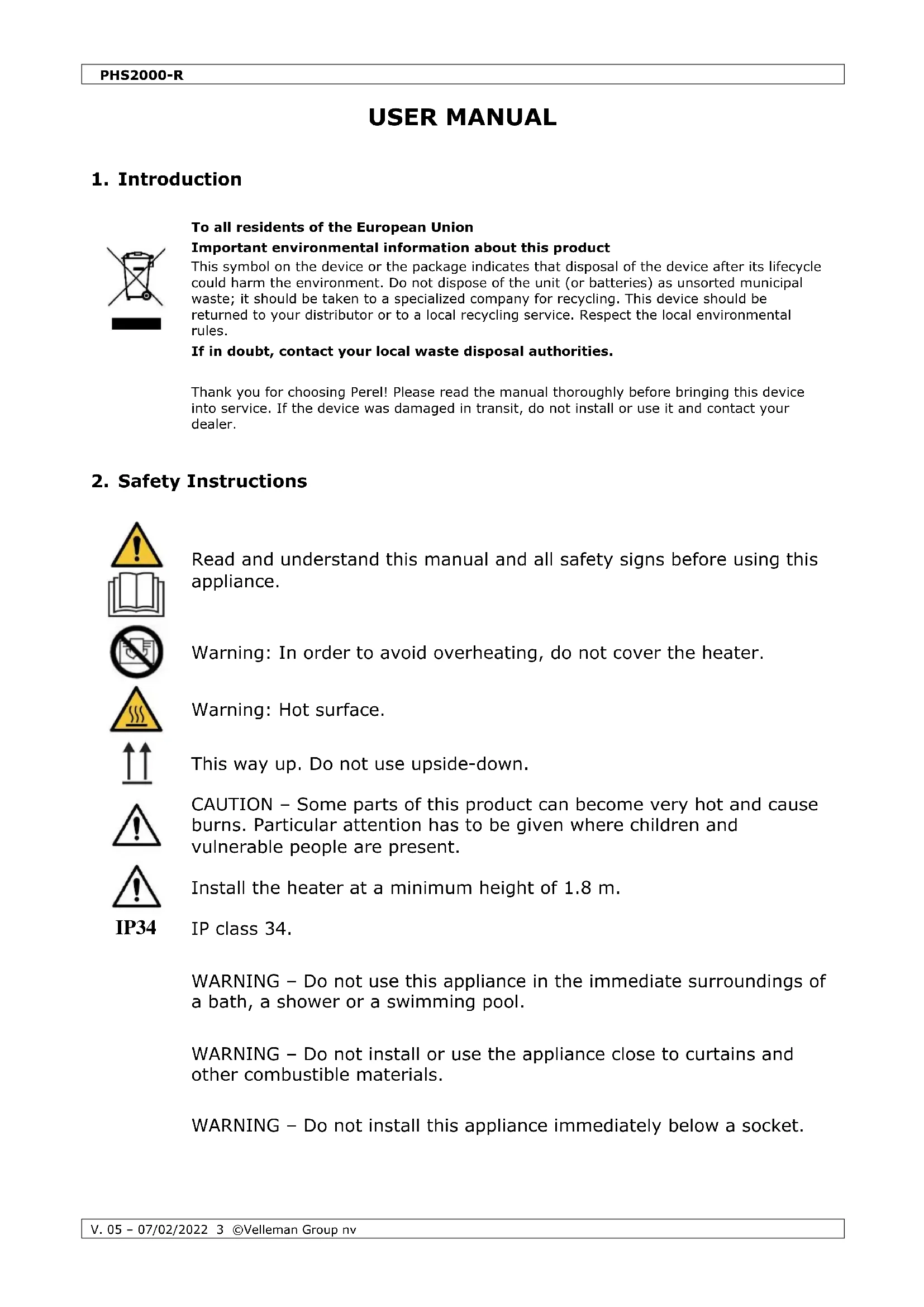 Download the instructions for your Heating in PDF format for free! Find your manual PHS2000R - Perel and take your electronic device back in hand. On this page are published all the documents necessary for the use of your device. PHS2000R by Perel.