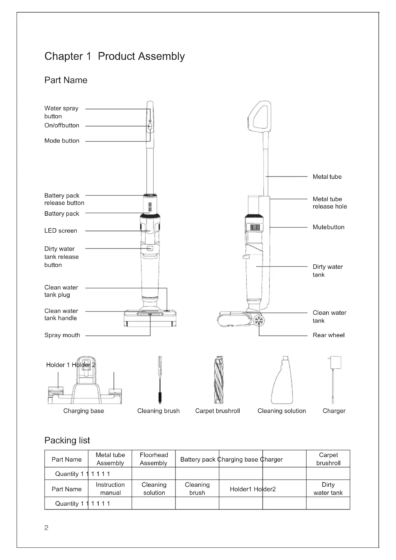 Water spray button On/off button Mode button Battery pack release button Dirty water tank release button Clean water tank handle Spray mouth Clean water tank plug Battery pack LED screen Metal tube Metal tube release hole Mute button Dirty water tank Clean water tank Rear wheel Charging base Cleaning brush Carpet brushroll Cleaning solution Charger Holder 1 Holder 2 Packing list Part Name Metal tube Assembly Floorhead Assembly Battery pack Charging base Charger Carpet brushroll Quantity 1 1 1 1 1 1 Part Name Instruction manual Cleaning solution Cleaning brush Holder1 Holder2 Dirty water tank Quantity 1 1 1 1 1 13