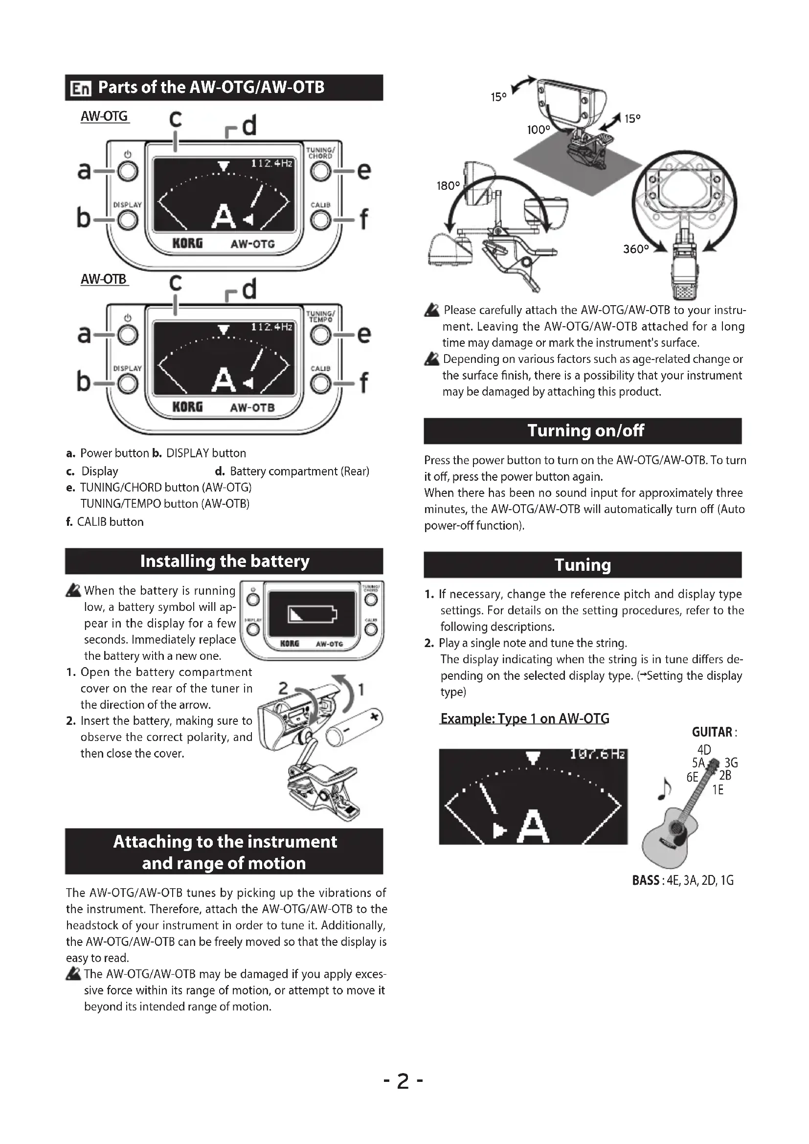 observe the correct polarity, and then close the cover. Attaching to the instrument and range of motion The AW-OTG/AW-OTB tunes by picking up the vibrations of the instrument. Therefore, attach the AW-OTG/AW-OTB to the headstock of your instrument in order to tune it. Additionally, the AW-OTG/AW-OTB can be freely moved so that the display is easy to read. The AW-OTG/AW-OTB may be damaged if you apply exces- sive force within its range of motion, or attempt to move it beyond its intended range of motion. 15° 15° 100° 180° 360° Please carefully attach the AW-OTG/AW-OTB to your instru- ment. Leaving the AW-OTG/AW-OTB attached for a long time may damage or mark the instrument's surface. Depending on various factors such as age-related change or the surface nish, there is a possibility that your instrument may be damaged by attaching this product. Turning on/o Press the power button to turn on the AW-OTG/AW-OTB. To turn it o, press the power button again. When there has been no sound input for approximately three minutes, the AW-OTG/AW-OTB will automatically turn o (Auto power-o function). Tuning
