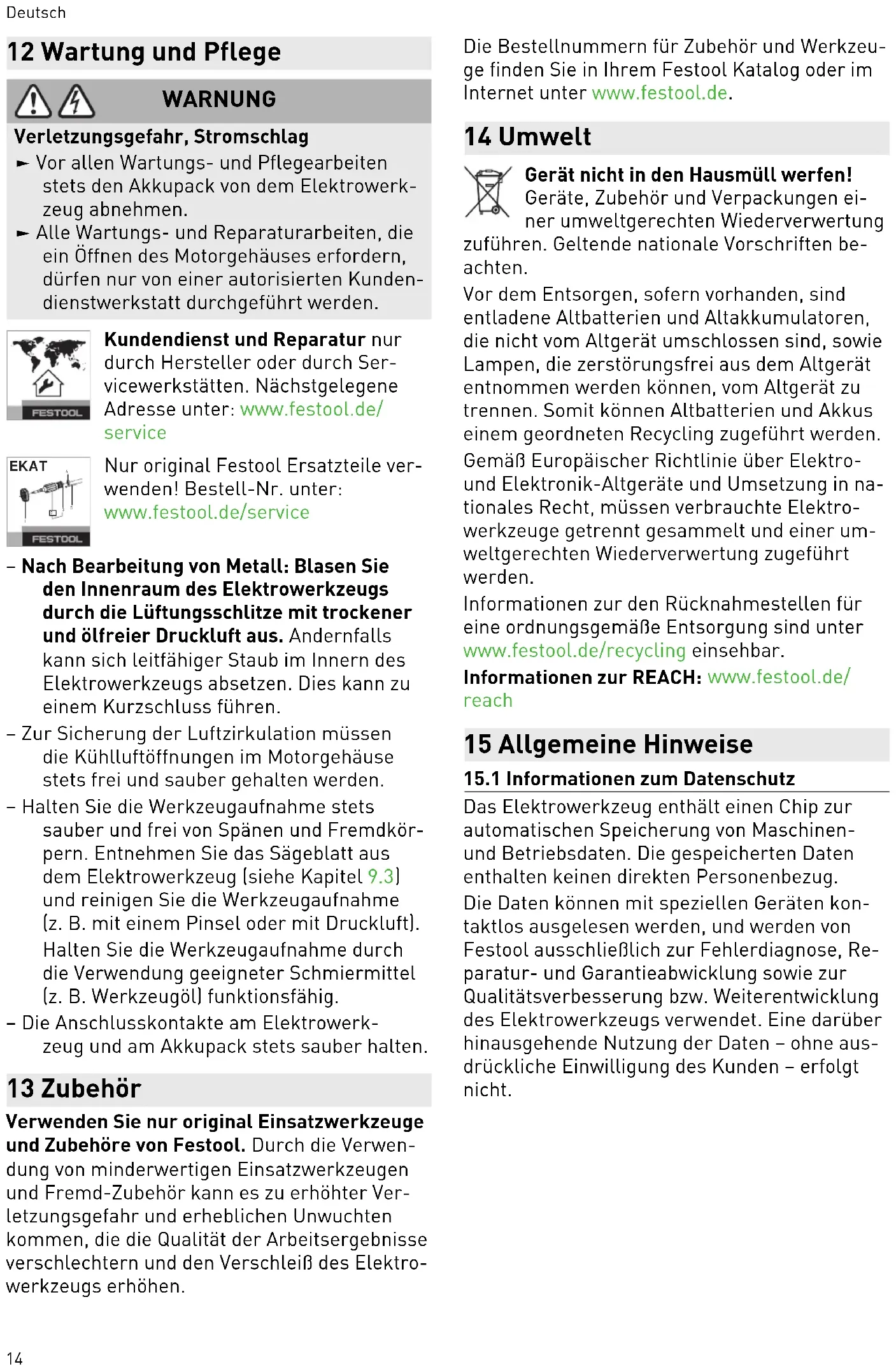 – After machining metal: Blow out the inside of the power tool through the vents using dry, oil-free compressed air. Otherwise, conductive dust deposits may build up in side the power tool. This can cause a short- circuit. – To ensure constant air circulation, always keep the cooling air openings in the motor housing clean and free of blockages. – Always keep the tool holder clean and free from chips and foreign objects. Remove the saw blade from the power tool (see sec tion 9.3) and clean the tool holder (e. g. with a brush or compressed air). Keep the tool holder in good working order by using suitable lubricant (e.g. tool lubri cant). – Always keep the contacts on the power tool and battery pack clean. 13 Accessories Always use original Festool tools and accesso ries. Using low-quality tools or accessories from other manufacturers may increase the risk of injury and seriously unbalance the ma chine, decreasing the quality of the working re sults and accelerating power tool wear. Refer to the Festool catalogue for the order numbers of accessories and tools or find them online at www.festool.co.uk. English 2014 Environment Do not dispose of the device in the household waste! Recycle devices, ac cessories and packaging. Observe appli cable national regulations. Before disposal, users must remove discharged batteries, accumulators that are not enclosed by the device and lights that can be removed from the old device without causing damage, if these are present. The old batteries and re chargeable batteries can then be recycled sys tematically. In accordance with the European Directive on waste electrical and electronic equipment and implementation in national law, used power tools must be collected separately and handed in for environmentally friendly recycling. Information about collection points for correct disposal is available at www.festool.co.uk/ recycling
