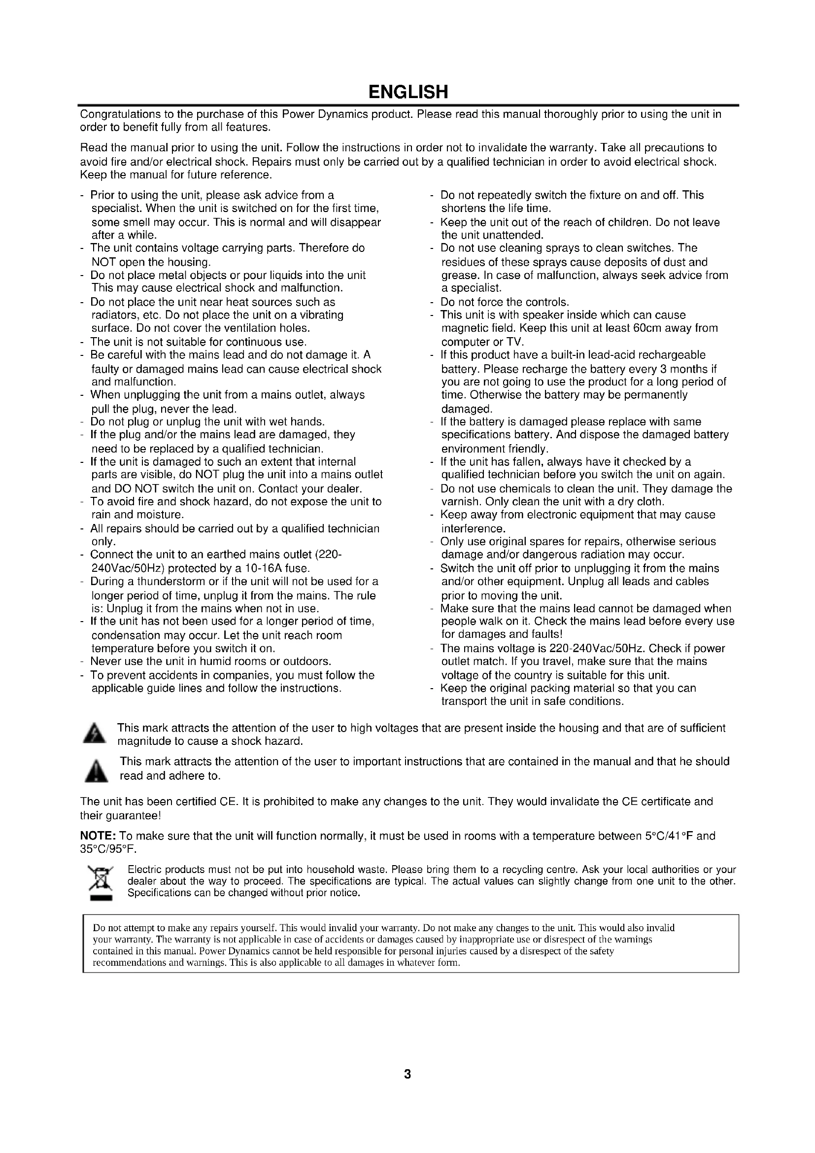 V1.323 ENGLISH Congratulations to the purchase of this Power Dynamics product. Please read this manual thoroughly prior to using the unit in order to benefit fully from all features. Read the manual prior to using the unit. Follow the instructions in order not to invalidate the warranty. Take all precautions to avoid fire and/or electrical shock. Repairs must only be carried out by a qualified technician in order to avoid electrical shock. Keep the manual for future reference. - Prior to using the unit, please ask advice from a specialist. When the unit is switched on for the first time, some smell may occur. This is normal and will disappear after a while. - The unit contains voltage carrying parts. Therefore do NOT open the housing. - Do not place metal objects or pour liquids into the unit This may cause electrical shock and malfunction. - Do not place the unit near heat sources such as radiators, etc. Do not place the unit on a vibrating surface. Do not cover the ventilation holes. - The unit is not suitable for continuous use. - Be careful with the mains lead and do not damage it. A faulty or damaged mains lead can cause electrical shock and malfunction. - When unplugging the unit from a mains outlet, always pull the plug, never the lead. - Do not plug or unplug the unit with wet hands. - If the plug and/or the mains lead are damaged, they need to be replaced by a qualified technician. - If the unit is damaged to such an extent that internal parts are visible, do NOT plug the unit into a mains outlet and DO NOT switch the unit on. Contact your dealer. - To avoid fire and shock hazard, do not expose the unit to rain and moisture. - All repairs should be carried out by a qualified technician only. - Connect the unit to an earthed mains outlet (220- 240Vac/50Hz) protected by a 10-16A fuse. - During a thunderstorm or if the unit will not be used for a longer period of time, unplug it from the mains. The rule is: Unplug it from the mains when not in use. - If the unit has not been used for a longer period of time, condensation may occur. Let the unit reach room temperature before you switch it on. - Never use the unit in humid rooms or outdoors. - To prevent accidents in companies, you must follow the applicable guide lines and follow the instructions. - Do not repeatedly switch the fixture on and off. This shortens the life time. - Keep the unit out of the reach of children. Do not leave the unit unattended. - Do not use cleaning sprays to clean switches. The residues of these sprays cause deposits of dust and grease. In case of malfunction, always seek advice from a specialist. - Do not force the controls. - This unit is with speaker inside which can cause magnetic field. Keep this unit at least 60cm away from computer or TV. - If this product have a built-in lead-acid rechargeable battery. Please recharge the battery every 3 months if you are not going to use the product for a long period of time. Otherwise the battery may be permanently damaged. - If the battery is damaged please replace with same specifications battery. And dispose the damaged battery environment friendly. - If the unit has fallen, always have it checked by a qualified technician before you switch the unit on again. - Do not use chemicals to clean the unit. They damage the varnish. Only clean the unit with a dry cloth. - Keep away from electronic equipment that may cause interference. - Only use original spares for repairs, otherwise serious damage and/or dangerous radiation may occur. - Switch the unit off prior to unplugging it from the mains and/or other equipment. Unplug all leads and cables prior to moving the unit. - Make sure that the mains lead cannot be damaged when people walk on it. Check the mains lead before every use for damages and faults! - The mains voltage is 220-240Vac/50Hz. Check if power outlet match. If you travel, make sure that the mains voltage of the country is suitable for this unit. - Keep the original packing material so that you can transport the unit in safe conditions. This mark attracts the attention of the user to high voltages that are present inside the housing and that are of sufficient magnitude to cause a shock hazard. This mark attracts the attention of the user to important instructions that are contained in the manual and that he should read and adhere to. The unit has been certified CE. It is prohibited to make any changes to the unit. They would invalidate the CE certificate and their guarantee! NOTE: To make sure that the unit will function normally, it must be used in rooms with a temperature between 5°C/41°F and 35°C/95°F. Electric products must not be put into household waste. Please bring them to a recycling centre. Ask your local authorities or your dealer about the way to proceed. The specifications are typical. The actual values can slightly change from one unit to the other. Specifications can be changed without prior notice. Do not attempt to make any repairs yourself. This would invalid your warranty. Do not make any changes to the unit. This would also invalid your warranty. The warranty is not applicable in case of accidents or damages caused by inappropriate use or disrespect of the warnings contained in this manual. Power Dynamics cannot be held responsible for personal injuries caused by a disrespect of the safety recommendations and warnings. This is also applicable to all damages in whatever form.4 UNPACKING INSTRUCTION CAUTION! Immediately upon receiving the product, carefully unpack the carton, check the contents to ensure that all parts are present, and have been received in good condition. Notify the shipper immediately and retain packing material for inspection if any parts appear damage from shipping or the package itself shows signs of mishandling. Save the package and all packing materials. In the event that the product must be returned to the factory, it is important that the product be returned in the original factory box and packing. If the