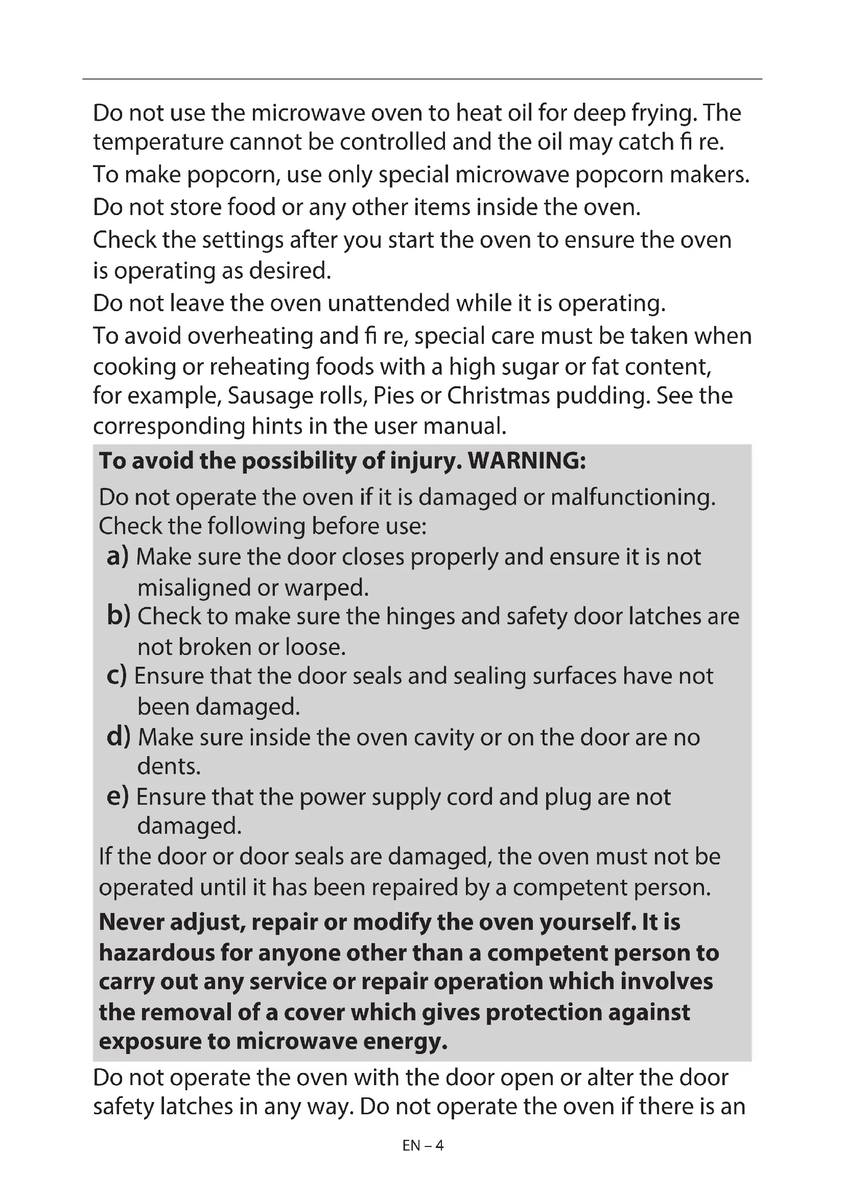 READ CAREFULLY AND KEEP FOR FUTURE REFERENCE To avoid the danger of re. The microwave oven should not be left unattended during operation. Power levels that are too high, or cooking times that are too long, may overheat foods resulting in a re. This oven is designed to be used on a countertop only. It is not designed to be built into a kitchen unit. Do not place the oven in a cabinet. The electrical outlet must be readily accessible so that the unit can be unplugged easily in an emergency. The AC power supply must be 230-240 V, 50 Hz, with a minimum 10 A distribution line fuse, or a minimum 10A distribution circuit breaker. A separate circuit serving only this appliance should be provided. Do not place the oven in areas where heat is generated. For example, close to a conventional oven. Do not install the oven in an area of high humidity or where moisture may collect. Do not store or use the oven outdoors. If smoke is observed, switch off or unplug the oven and keep the door closed in order to sti e any ames. Use only microwave-safe containers and utensils. Utensils should be checked to ensure that they are suitable for use in microwave ovens. When heating food in plastic or paper containers, keep an eye on the oven due to the possibility of ignition. Clean the waveguide cover and the oven cavity. These must be dry and free from grease. Built up grease may overheat and begin to smoke or catch re. Do not place ammable materials near the oven or ventilation openings. Do not block the ventilation openings. Remove all metallic seals, wire twists, etc., from food and food packages. Arcing on metallic surfaces may cause a re.EN – 4 EN – 4 Do not use the microwave oven to heat oil for deep frying. The temperature cannot be controlled and the oil may catch re. To make popcorn, use only special microwave popcorn makers. Do not store food or any other items inside the oven. Check the settings after you start the oven to ensure the oven is operating as desired. Do not leave the oven unattended while it is operating. To avoid overheating and re, special care must be taken when cooking or reheating foods with a high sugar or fat content, for example, Sausage rolls, Pies or Christmas pudding. See the corresponding hints in the user manual. To avoid the possibility of injury. WARNING: Do not operate the oven if it is damaged or malfunctioning. Check the following before use: a) Make sure the door closes properly and ensure it is not misaligned or warped. b) Check to make sure the hinges and safety door latches are not broken or loose. c) Ensure that the door seals and sealing surfaces have not been damaged. d) Make sure inside the oven cavity or on the door are no dents. e) Ensure that the power supply cord and plug are not damaged. If the door or door seals are damaged, the oven must not be operated until it has been repaired by a competent person. Never adjust, repair or modify the oven yourself. It is hazardous for anyone other than a competent person to carry out any service or repair operation which involves the removal of a cover which gives protection against exposure to microwave energy. Do not operate the oven with the door open or alter the door safety latches in any way. Do not operate the oven if there is anEN EN – 4EN – 4 Do not use the microwave oven to heat oil for deep frying. The temperature cannot be controlled and the oil may catch re. To make popcorn, use only special microwave popcorn makers. Do not store food or any other items inside the oven. Check the settings after you start the oven to ensure the oven is operating as desired. Do not leave the oven unattended while it is operating. To avoid overheating and re, special care must be taken when cooking or reheating foods with a high sugar or fat content, for example, Sausage rolls, Pies or Christmas pudding. See the corresponding hints in the user manual. To avoid the possibility of injury. WARNING: Do not operate the oven if it is damaged or malfunctioning. Check the following before use: a) Make sure the door closes properly and ensure it is not misaligned or warped. b) Check to make sure the hinges and safety door latches are not broken or loose. c) Ensure that the door seals and sealing surfaces have not been damaged. d) Make sure inside the oven cavity or on the door are no dents. e) Ensure that the power supply cord and plug are not damaged. If the door or door seals are damaged, the oven must not be operated until it has been repaired by a competent person. Never adjust, repair or modify the oven yourself. It is hazardous for anyone other than a competent person to carry out any service or repair operation which involves the removal of a cover which gives protection against exposure to microwave energy. Do not operate the oven with the door open or alter the door safety latches in any way. Do not operate the oven if there is an EN – 5 EN – 5 object between the door seals and sealing surfaces. Do not allow grease or dirt to build up on the door seals and adjacent parts. Clean the oven at regular intervals and remove any food deposits. Follow the instructions for “Care and Cleaning”. Failure to maintain the oven in a clean condition could lead to a deterioration of the surface that could adversely aff ect the life of the appliance and possibly result in a hazardous situation. Individuals with PACEMAKERS should check with their doctor or the manufacturer of the pacemaker for precautions regarding microwave ovens. To avoid the possibility of electric shock.