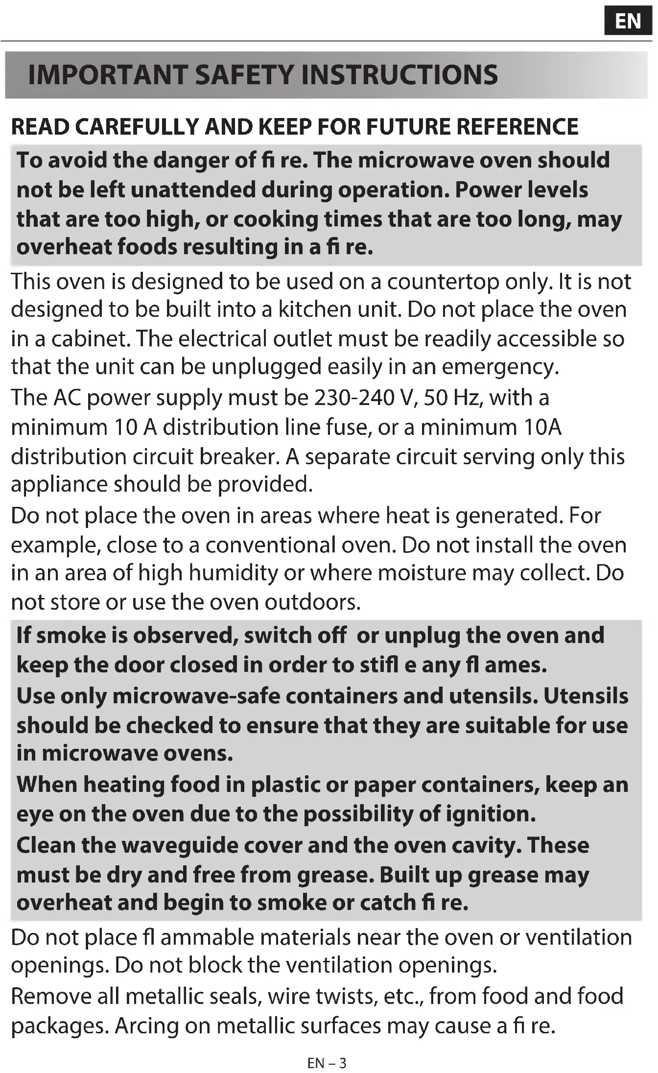 READ CAREFULLY AND KEEP FOR FUTURE REFERENCE To avoid the danger of re. The microwave oven should not be left unattended during operation. Power levels that are too high, or cooking times that are too long, may overheat foods resulting in a re. This oven is designed to be used on a countertop only. It is not designed to be built into a kitchen unit. Do not place the oven in a cabinet. The electrical outlet must be readily accessible so that the unit can be unplugged easily in an emergency. The AC power supply must be 230-240 V, 50 Hz, with a minimum 10 A distribution line fuse, or a minimum 10A distribution circuit breaker. A separate circuit serving only this appliance should be provided. Do not place the oven in areas where heat is generated. For example, close to a conventional oven. Do not install the oven in an area of high humidity or where moisture may collect. Do not store or use the oven outdoors. If smoke is observed, switch off or unplug the oven and keep the door closed in order to sti e any ames. Use only microwave-safe containers and utensils. Utensils should be checked to ensure that they are suitable for use in microwave ovens. When heating food in plastic or paper containers, keep an eye on the oven due to the possibility of ignition. Clean the waveguide cover and the oven cavity. These must be dry and free from grease. Built up grease may overheat and begin to smoke or catch re. Do not place ammable materials near the oven or ventilation openings. Do not block the ventilation openings. Remove all metallic seals, wire twists, etc., from food and food packages. Arcing on metallic surfaces may cause a re.EN – 4 EN – 4 Do not use the microwave oven to heat oil for deep frying. The temperature cannot be controlled and the oil may catch re. To make popcorn, use only special microwave popcorn makers. Do not store food or any other items inside the oven. Check the settings after you start the oven to ensure the oven is operating as desired. Do not leave the oven unattended while it is operating. To avoid overheating and re, special care must be taken when cooking or reheating foods with a high sugar or fat content, for example, Sausage rolls, Pies or Christmas pudding. See the corresponding hints in the user manual. To avoid the possibility of injury. WARNING: Do not operate the oven if it is damaged or malfunctioning. Check the following before use: a) Make sure the door closes properly and ensure it is not misaligned or warped. b) Check to make sure the hinges and safety door latches are not broken or loose. c) Ensure that the door seals and sealing surfaces have not been damaged. d) Make sure inside the oven cavity or on the door are no dents. e) Ensure that the power supply cord and plug are not damaged. If the door or door seals are damaged, the oven must not be operated until it has been repaired by a competent person. Never adjust, repair or modify the oven yourself. It is hazardous for anyone other than a competent person to carry out any service or repair operation which involves the removal of a cover which gives protection against exposure to microwave energy. Do not operate the oven with the door open or alter the door safety latches in any way. Do not operate the oven if there is anEN EN – 4EN – 4 Do not use the microwave oven to heat oil for deep frying. The temperature cannot be controlled and the oil may catch re. To make popcorn, use only special microwave popcorn makers. Do not store food or any other items inside the oven. Check the settings after you start the oven to ensure the oven is operating as desired. Do not leave the oven unattended while it is operating. To avoid overheating and re, special care must be taken when cooking or reheating foods with a high sugar or fat content, for example, Sausage rolls, Pies or Christmas pudding. See the corresponding hints in the user manual. To avoid the possibility of injury. WARNING: Do not operate the oven if it is damaged or malfunctioning. Check the following before use: a) Make sure the door closes properly and ensure it is not misaligned or warped. b) Check to make sure the hinges and safety door latches are not broken or loose. c) Ensure that the door seals and sealing surfaces have not been damaged. d) Make sure inside the oven cavity or on the door are no dents. e) Ensure that the power supply cord and plug are not damaged. If the door or door seals are damaged, the oven must not be operated until it has been repaired by a competent person. Never adjust, repair or modify the oven yourself. It is hazardous for anyone other than a competent person to carry out any service or repair operation which involves the removal of a cover which gives protection against exposure to microwave energy. Do not operate the oven with the door open or alter the door safety latches in any way. Do not operate the oven if there is an EN – 5 EN – 5 object between the door seals and sealing surfaces. Do not allow grease or dirt to build up on the door seals and adjacent parts. Clean the oven at regular intervals and remove any food deposits. Follow the instructions for “Care and Cleaning”. Failure to maintain the oven in a clean condition could lead to a deterioration of the surface that could adversely aff ect the life of the appliance and possibly result in a hazardous situation. Individuals with PACEMAKERS should check with their doctor or the manufacturer of the pacemaker for precautions regarding microwave ovens. To avoid the possibility of electric shock.
