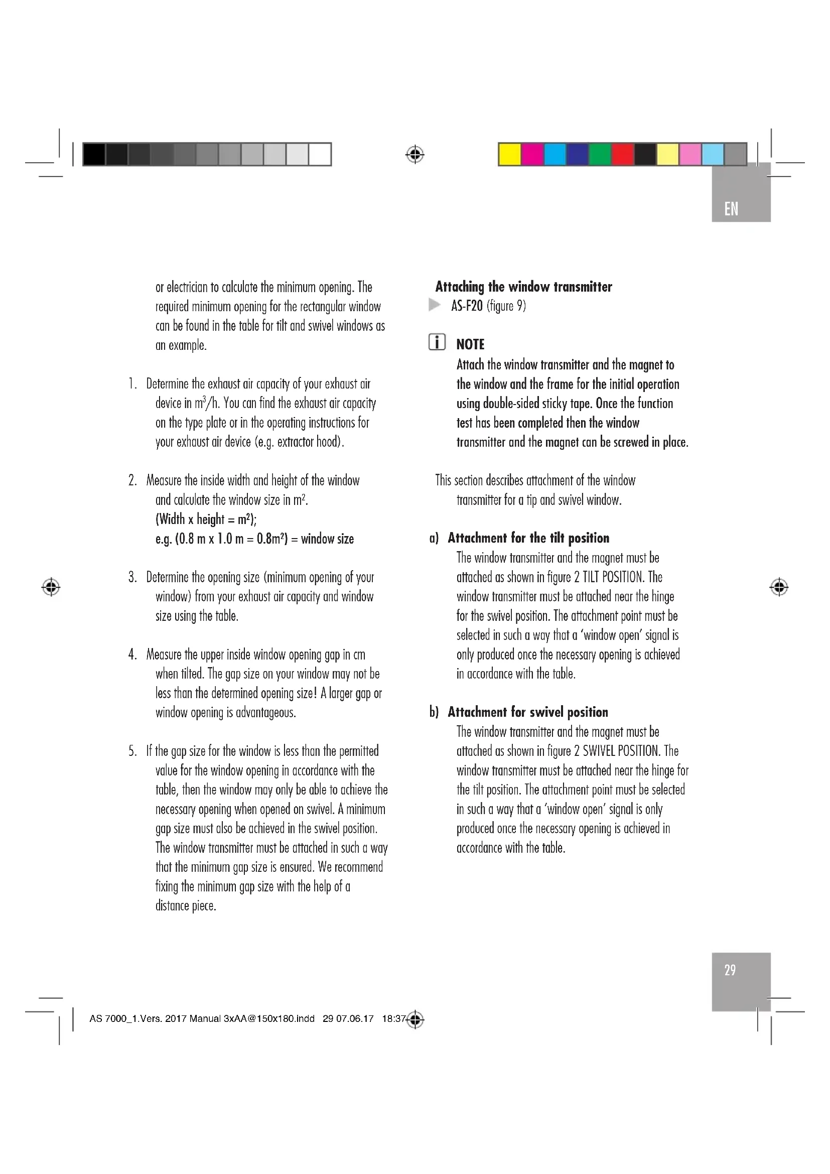 AS 7000_1.Vers. 2017 Manual 3xAA@150x180.indd 26 07.06.17 18:37Installation instructions for the window transmitter AS-F20 and the magnet (see figures 9 and 14) Some points need to be explained and followed in order to install the window transmitter and the magnet to the top window frame and to the window casements. The distance around all sides of the casing parts must be less than 7 mm and the minimum opening on the window (table 1) must be achieved. Please use the included packing parts (U) in order to adjust the height of the magnet. NOTE The window transmitter should not be installed directly on a metal window frame as this can reduce ranges. PREPARATION Minimum width of window opening This is based on: a) The performance of the exhaust air device in m³/h b) The size of the window to be opened in m² c) The size of the window opening in cm (see table 1) Most kitchens have rectangular tilt and swivel windows. If you have windows that are, for example, round, then please ask the installation technician, heating engineer INSTALLATION We recommend having the device installed by an installation technician and heating engineer or by an electrical installation technician. Correct installation guarantees the long term, safe operation of the exhaust air controller. The regional chimney sweep can and should carry out a function test. Installation instructions AS-7000 central unit (receiver) (see figure 2) Please proceed as follows to install the receiver: