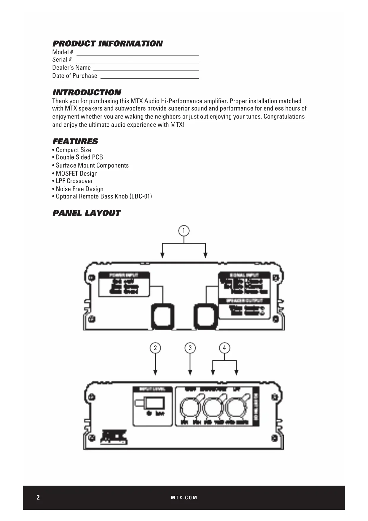 PRODUCT INFORMATION Model # Serial # Dealer’s Name Date of Purchase INTRODUCTION Thank you for purchasing this MTX Audio Hi-Performance amplier. Proper installation matched with MTX speakers and subwoofers provide superior sound and performance for endless hours of enjoyment whether you are waking the neighbors or just out enjoying your tunes. Congratulations and enjoy the ultimate audio experience with MTX! FEATURES