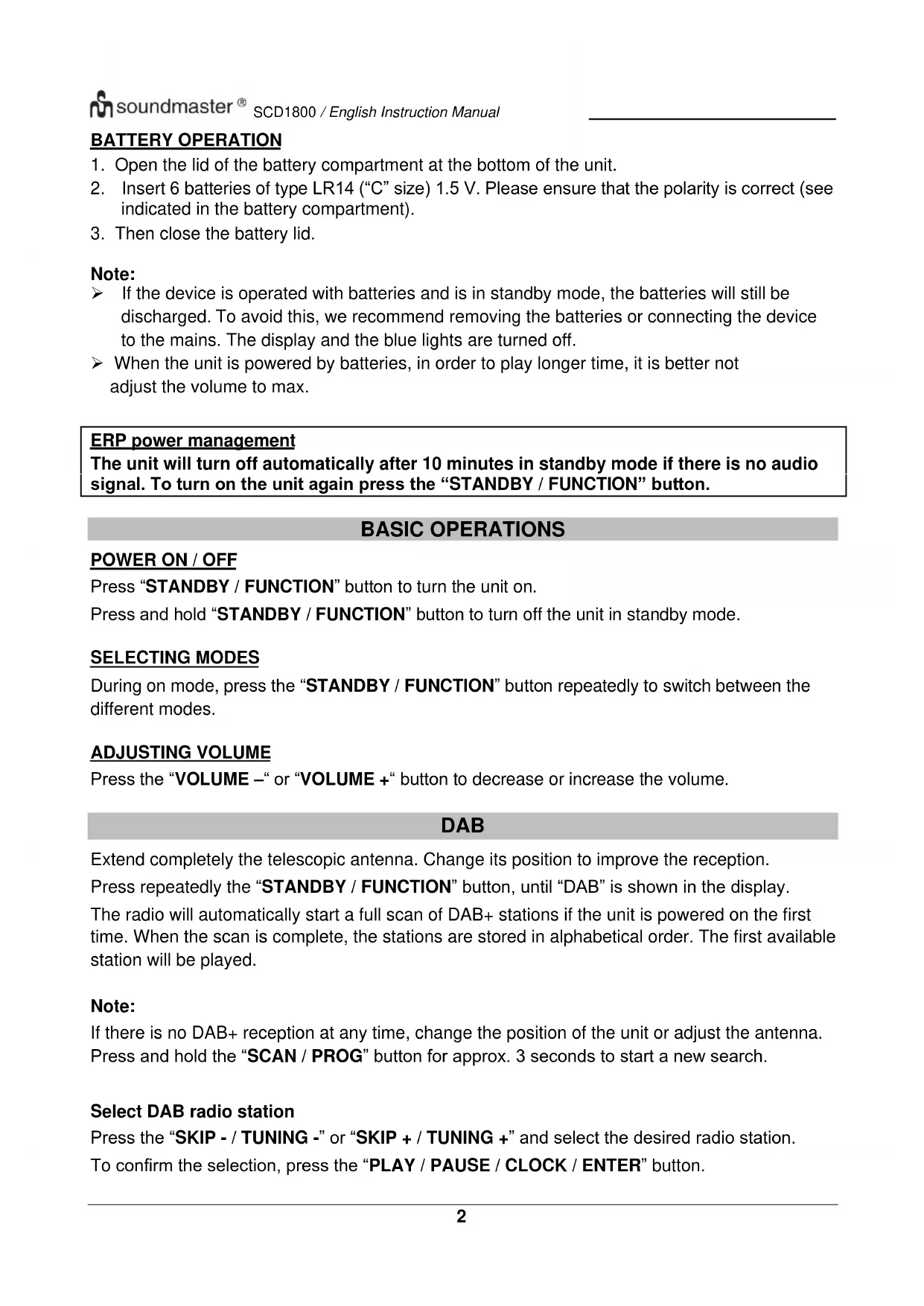Press “STANDBY / FUNCTION” button to turn the unit on. Press and hold “STANDBY / FUNCTION” button to turn off the unit in standby mode. SELECTING MODES During on mode, press the “STANDBY / FUNCTION” button repeatedly to switch between the different modes. ADJUSTING VOLUME Press the “VOLUME –“ or “VOLUME +“ button to decrease or increase the volume. DAB Extend completely the telescopic antenna. Change its position to improve the reception. Press repeatedly the “STANDBY / FUNCTION” button, until “DAB” is shown in the display. The radio will automatically start a full scan of DAB+ stations if the unit is powered on the first time. When the scan is complete, the stations are stored in alphabetical order. The first available station will be played. Note: If there is no DAB+ reception at any time, change the position of the unit or adjust the antenna. Press and hold the “SCAN / PROG” button for approx. 3 seconds to start a new search. Select DAB radio station Press the “SKIP - / TUNING -” or “SKIP + / TUNING +” and select the desired radio station. To confirm the selection, press the “PLAY / PAUSE / CLOCK / ENTER” button.SCD1800 / English Instruction Manual