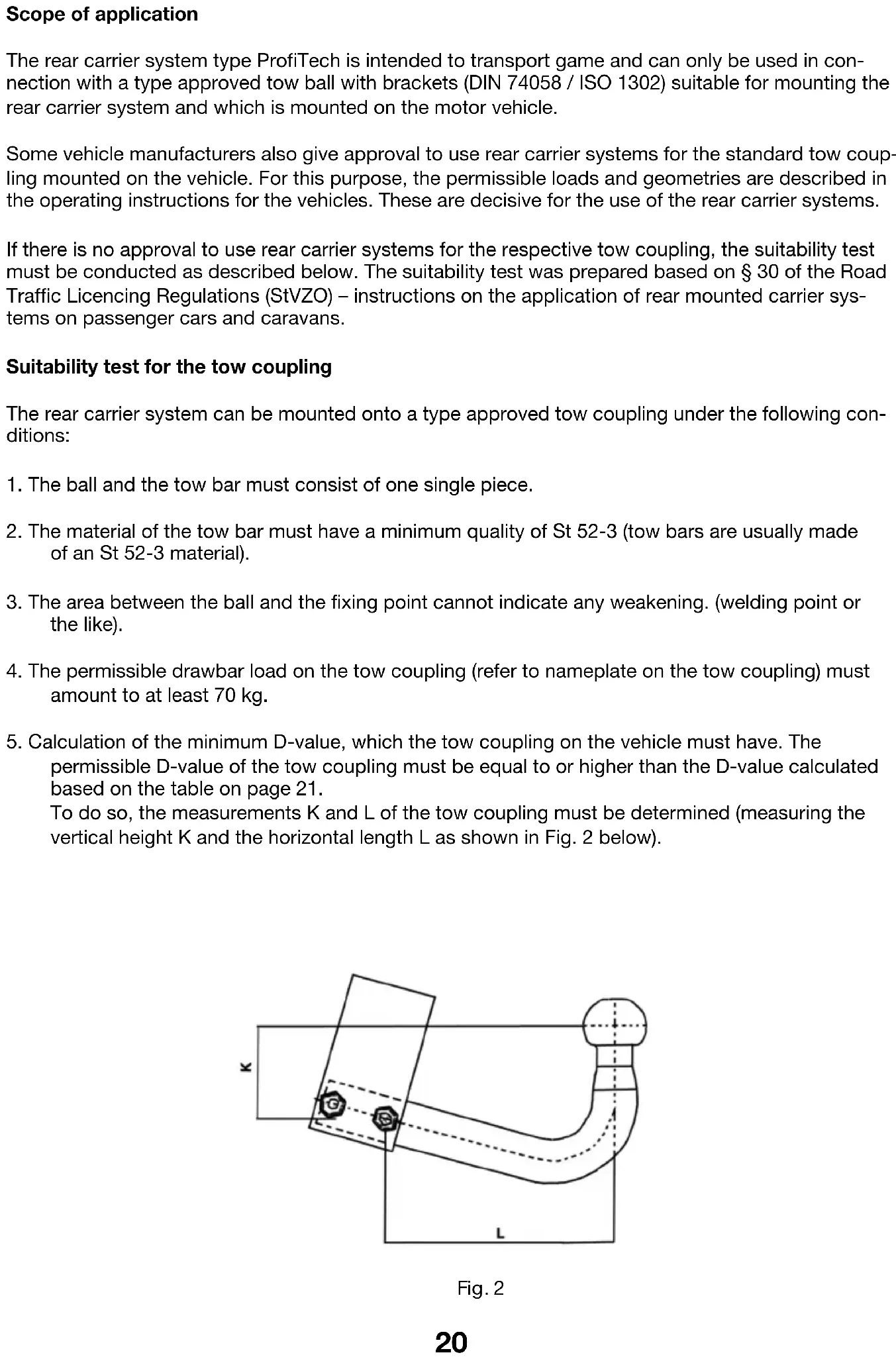 Rear carrier side viewMounting plate for the quick-release mechanism20 Scope of application The rear carrier system type ProfiTech is intended to transport game and can only be used in con- nection with a type approved tow ball with brackets (DIN 74058 / ISO 1302) suitable for mounting the rear carrier system and which is mounted on the motor vehicle. Some vehicle manufacturers also give approval to use rear carrier systems for the standard tow coup- ling mounted on the vehicle. For this purpose, the permissible loads and geometries are described in the operating instructions for the vehicles. These are decisive for the use of the rear carrier systems. If there is no approval to use rear carrier systems for the respective tow coupling, the suitability test must be conducted as described below. The suitability test was prepared based on § 30 of the Road Traffic Licencing Regulations (StVZO) – instructions on the application of rear mounted carrier sys- tems on passenger cars and caravans. Suitability test for the tow coupling The rear carrier system can be mounted onto a type approved tow coupling under the following con- ditions: