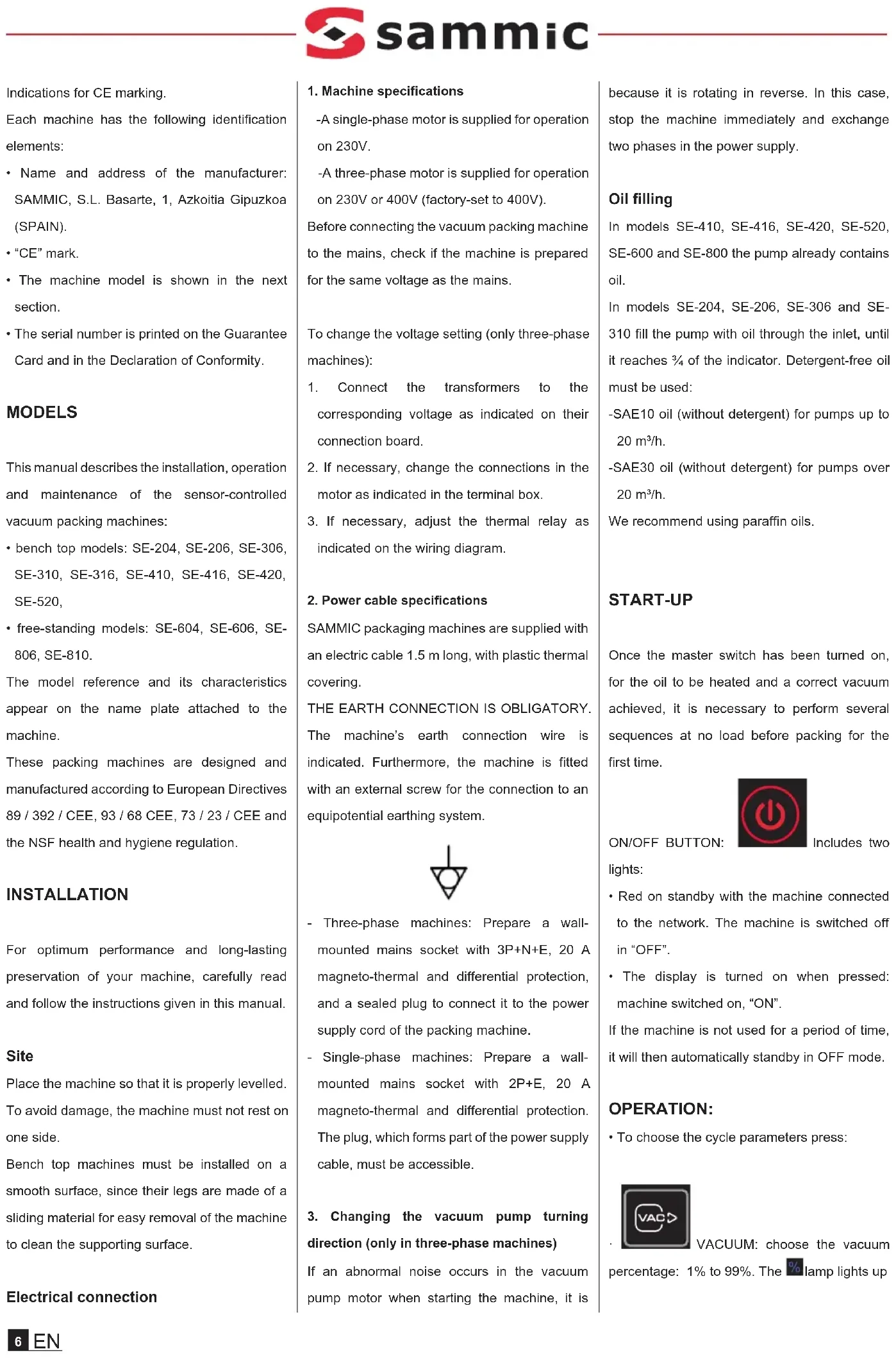 - free-standing models: SE-604, SE-606, SE- 806, SE-810. The model reference and its characteristics appear on the name plate attached to the machine. These packing machines are designed and manufactured according to European Directives 89 / 392 / CEE, 93 / 68 CEE, 73 / 23 / CEE and the NSF health and hygiene regulation. INSTALLATION For optimum performance and long-lasting preservation of your machine, carefully read and follow the instructions given in this manual. Site Place the machine so that it is properly levelled. To avoid damage, the machine must not rest on one side. Bench top machines must be installed on a smooth surface, since their legs are made of a sliding material for easy removal of the machine to clean the supporting surface. Electrical connection