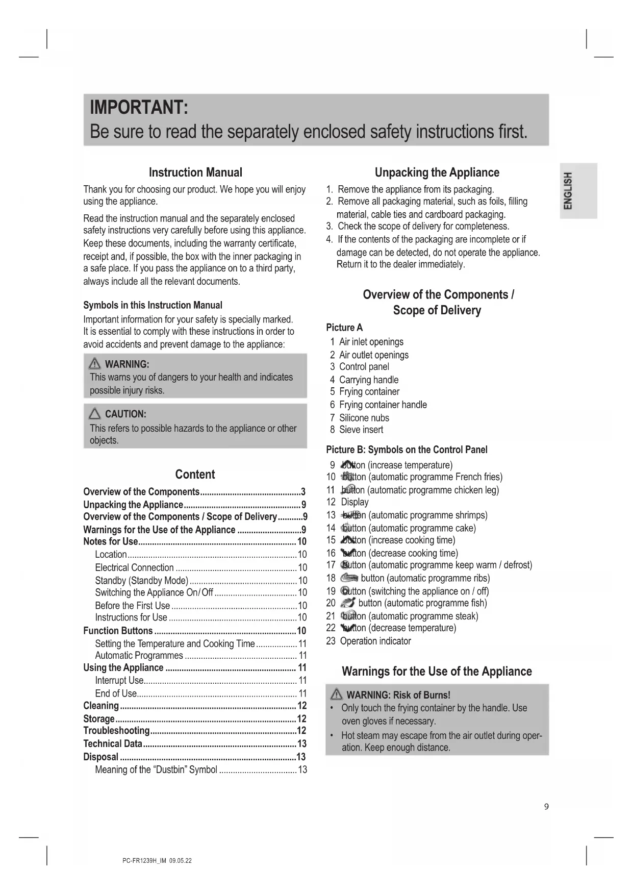 damage can be detected, do not operate the appliance. Return it to the dealer immediately. Overview of the Components / Scope of Delivery Picture A 1 Air inlet openings 2 Air outlet openings 3 Control panel 4 Carrying handle 5 Frying container 6 Frying container handle 7 Silicone nubs 8 Sieve insert Picture B: Symbols on the Control Panel 9 button (increase temperature) 10 button (automatic programme French fries) 11 button (automatic programme chicken leg) 12 Display 13 button (automatic programme shrimps) 14 button (automatic programme cake) 15 button (increase cooking time) 16 button (decrease cooking time) 17 button (automatic programme keep warm / defrost) 18 button (automatic programme ribs) 19 button (switching the appliance on / off) 20 button (automatic programme sh) 21 button (automatic programme steak) 22 button (decrease temperature) 23 Operation indicator Warnings for the Use of the Appliance