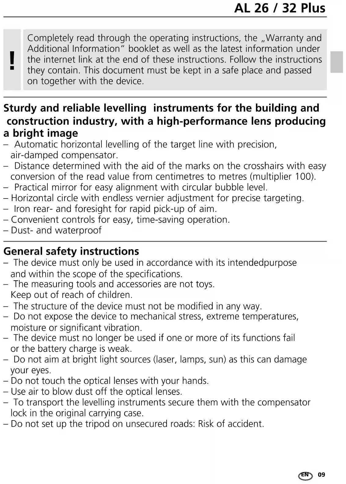 Telescope Magnification 26 x (AL 26) / 32 x (AL 32) Minimum range 0.5 m Objective diameter 40 mm Field of view 1° 20‘ Compensator Damping Air damping Range of operation ± 15‘ Accuray 0.4" (AL 26) / 0.3" (AL 32) Compensation time < 2 s Horizontal dial 360° Graduation 1° Levelling bubble Accuray 8‘ / 2 mm General Operating conditions -20°C … 50°C, max. humidity 80% rH, no condensation, max. working altitude 4000 m above sea level Storage conditions -30°C … 60°C, max. humidity 80% rH Degree of protection IP 64 Tripod adapter 5/8" thread Dimensions (W x H x D) 190 x 145 x 135 mm Weight 1400 g (without accessories)AL 26 / 32 Plus