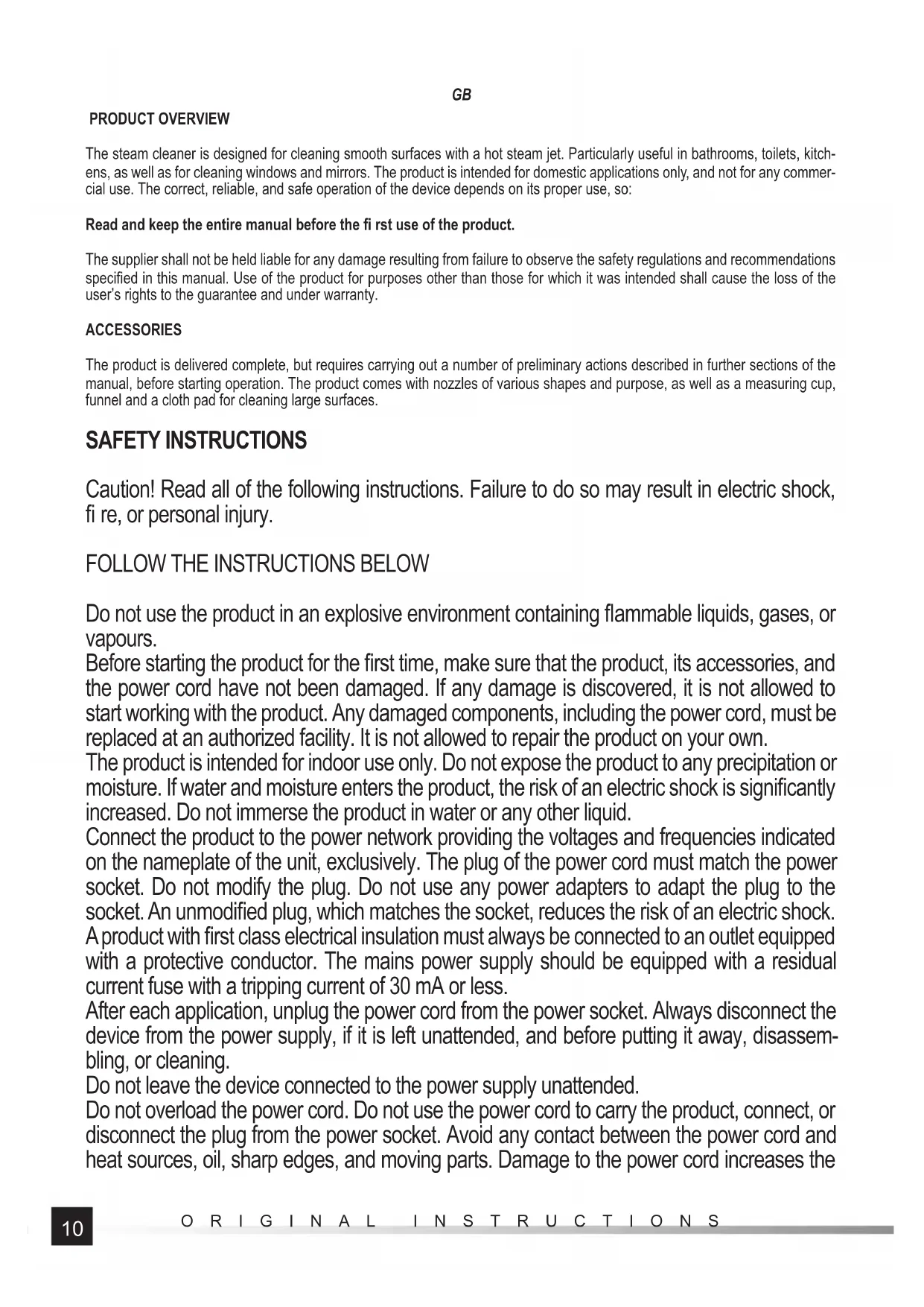 ORIGINAL INSTRUCTIONS PRODUCT OVERVIEW The steam cleaner is designed for cleaning smooth surfaces with a hot steam jet. Particularly useful in bathrooms, toilets, kitch- ens, as well as for cleaning windows and mirrors. The product is intended for domestic applications only, and not for any commer- cial use. The correct, reliable, and safe operation of the device depends on its proper use, so: Read and keep the entire manual before the fi rst use of the product. The supplier shall not be held liable for any damage resulting from failure to observe the safety regulations and recommendations specifi ed in this manual. Use of the product for purposes other than those for which it was intended shall cause the loss of the user’s rights to the guarantee and under warranty. ACCESSORIES The product is delivered complete, but requires carrying out a number of preliminary actions described in further sections of the manual, before starting operation. The product comes with nozzles of various shapes and purpose, as well as a measuring cup, funnel and a cloth pad for cleaning large surfaces. SAFETY INSTRUCTIONS Caution! Read all of the following instructions. Failure to do so may result in electric shock, fi re, or personal injury.