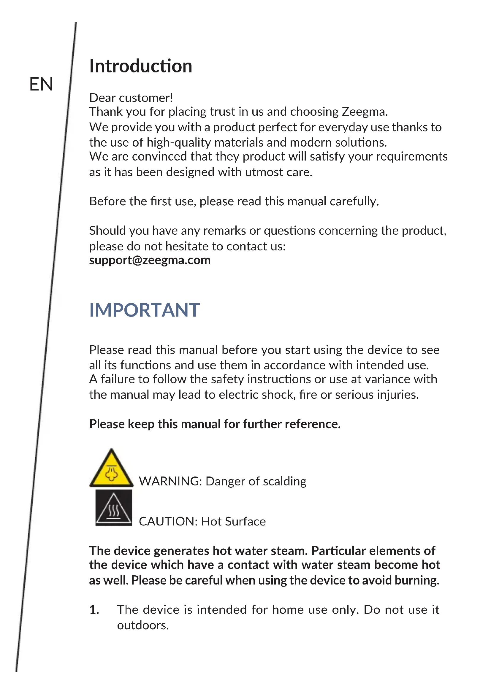 CAUTION: Hot Surface The device generates hot water steam. Parcular elements of the device which have a contact with water steam become hot as well. Please be careful when using the device to avoid burning.