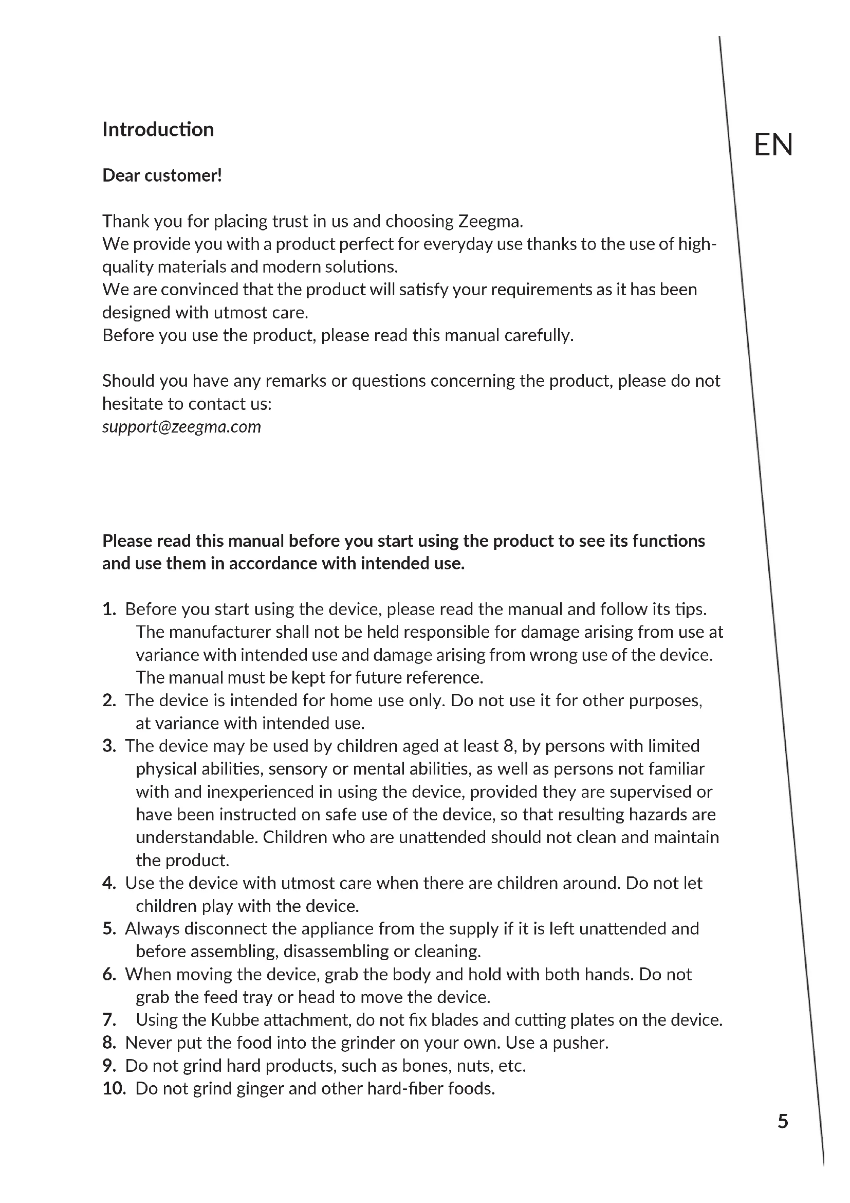 Introducon Dear customer! Thank you for placing trust in us and choosing Zeegma. We provide you with a product perfect for everyday use thanks to the use of high- quality materials and modern soluons. We are convinced that the product will sasfy your requirements as it has been designed with utmost care. Before you use the product, please read this manual carefully. Should you have any remarks or quesons concerning the product, please do not hesitate to contact us: support@zeegma.com Important Please read this manual before you start using the product to see its funcons and use them in accordance with intended use.