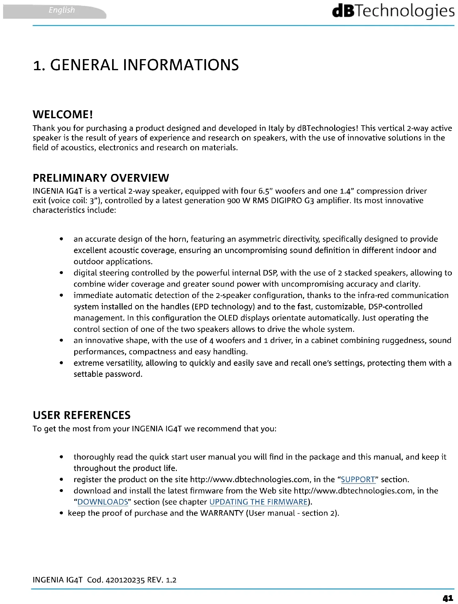 - According to the standards EN 55103 this equipment is designed and suitable to operate in E3 (or lower E2, E1) Electromagnetic environments. This device complies with part 15 of the FCC Rules. Operation is subject to the following two conditions: (1) This device may not cause harmful interference, and (2) this device must accept any interference received, including interference that may cause undesired operation. Make sure that the loudspeaker is securely installed in a stable position to avoid any injuries or damages to persons or properties. For safety reasons di not place one loudspeaker on top of another without proper fastening systems. Before hanging the loudspeaker check all the components for damages, deformations, missing or damaged parts that may compromise safety during installation. If you use the loudspeakers outdoor avoid spots exposed to bad weather conditions. Contact dBTechnologies for accessories to be used with the speakers. dBTechnologies will not accept any responsibility for damages caused by inappropiate accessories or additional devices. WARNING3 INGENIA IG4T Cod. 420120235 REV. 1.2 ITALIANO ENGLISH DEUTSCH FRANÇAIS ESPAÑOL4 INGENIA IG4T Cod. 420120235 REV. 1.2 INDICE 1. INFORMAZIONI GENERALI p. 6