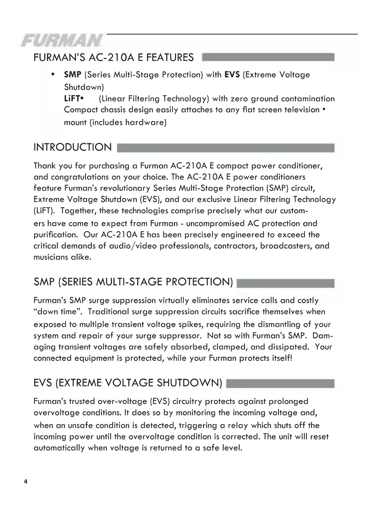 SMP• (Series Multi-Stage Protection) with EVS (Extreme Voltage Shutdown) LiFT• (Linear Filtering Technology) with zero ground contamination Compact chassis design easily attaches to any at screen television • mount (includes hardware) INTRODUCTION Thank you for purchasing a Furman AC-210A E compact power conditioner, and congratulations on your choice. The AC-210A E power conditioners feature Furman’s revolutionary Series Multi-Stage Protection (SMP) circuit, Extreme Voltage Shutdown (EVS), and our exclusive Linear Filtering Technology (LiFT). Together, these technologies comprise precisely what our custom- ers have come to expect from Furman - uncompromised AC protection and purication. Our AC-210A E has been precisely engineered to exceed the critical demands of audio/video professionals, contractors, broadcasters, and musicians alike. SMP (SERIES MULTI-STAGE PROTECTION) Furman’s SMP surge suppression virtually eliminates service calls and costly “down time”. Traditional surge suppression circuits sacrice themselves when exposed to multiple transient voltage spikes, requiring the dismantling of your system and repair of your surge suppressor. Not so with Furman’s SMP. Dam- aging transient voltages are safely absorbed, clamped, and dissipated. Your connected equipment is protected, while your Furman protects itself! EVS (EXTREME VOLTAGE SHUTDOWN) Furman’s trusted over-voltage (EVS) circuitry protects against prolonged overvoltage conditions. It does so by monitoring the incoming voltage and, when an unsafe condition is detected, triggering a relay which shuts off the incoming power until the overvoltage condition is corrected. The unit will reset automatically when voltage is returned to a safe level.FRANÇAIS ENGLISH ESpAÑoL