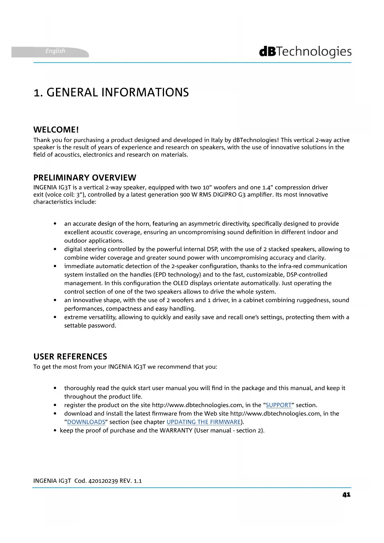 WELCOME! PRELIMINARY OVERVIEW USER REFERENCES Thank you for purchasing a product designed and developed in Italy by dBTechnologies! This vertical 2-way active speaker is the result of years of experience and research on speakers, with the use of innovative solutions in the eld of acoustics, electronics and research on materials. INGENIA IG3T is a vertical 2-way speaker, equipped with two 10” woofers and one 1.4” compression driver exit (voice coil: 3”), controlled by a latest generation 900 W RMS DIGIPRO G3 amplier. Its most innovative characteristics include: To get the most from your INGENIA IG3T we recommend that you: