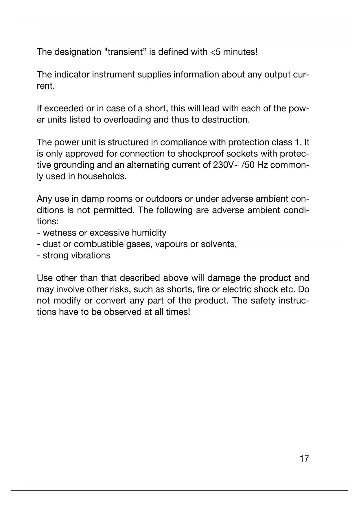 - Technical data Intended Use These stabilised fixed-voltage power units are suitable for the con- nection and operation of extra-low-voltage consumers. The following information is to be observed, depending on the device which you have purchased. Model output voltage - max. output current FSP-1122 12 Volt DC 2A continuous operation / transient 4A FSP-1243 24 Volt DC 3A continuous operation / transient 5A FSP-1132 13.8 Volt DC 2A continuous operation / transient 4A FSP-1134 13.8 Volt DC 4A continuous operation / transient 6A FSP-1136 13.8 Volt DC 6A continuous operation / transient 8A FSP-1138 13.8 Volt DC 8A continuous operation / transient 10A FSP-11312 13.8 Volt DC 12A continuous operation / transient 15A FSP-11320 13.8 Volt DC 20A continuous operation / transient 22A FSP-11330 13.8 Volt DC 30A continuous operation / transient 32A 16The designation "transient” is defined with <5 minutes! The indicator instrument supplies information about any output cur- rent. If exceeded or in case of a short, this will lead with each of the pow- er units listed to overloading and thus to destruction. The power unit is structured in compliance with protection class 1. It is only approved for connection to shockproof sockets with protec- tive grounding and an alternating current of 230V~ /50 Hz common- ly used in households. Any use in damp rooms or outdoors or under adverse ambient con- ditions is not permitted. The following are adverse ambient condi- tions: - wetness or excessive humidity - dust or combustible gases, vapours or solvents, - strong vibrations Use other than that described above will damage the product and may involve other risks, such as shorts, fire or electric shock etc. Do not modify or convert any part of the product. The safety instruc- tions have to be observed at all times! 17Safety instructions and danger warnings The guarantee will expire in case of damage caused by failure to comply with these operating instruc- tions! We do not accept liability for damage to prop- erty or injury to persons caused by mishandling or non-compliance with the safety instructions. This device left the factory in perfect condition in terms of safety engineering. To maintain this status and ensure safe operation, you, as user, must comply with the safety instructions and warnings contained in these instructions for use. The following symbols must be observed: Note! Read the instructions for use. This equipment is CE-tested and complies with the EMC directive 89/336/EEC and the low-voltage direc- tive 73/23/EEC. Safety isolating transformer p. 25