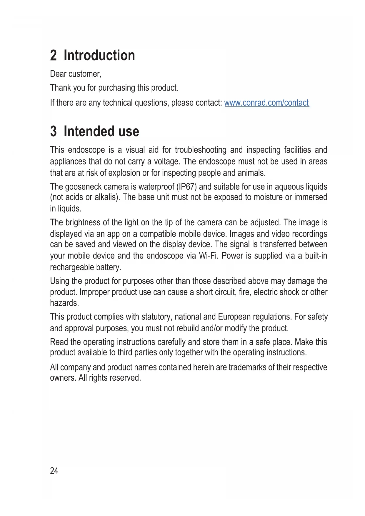 2 Introduction Dear customer, Thank you for purchasing this product. If there are any technical questions, please contact: www.conrad.com/contact 3 Intended use This endoscope is a visual aid for troubleshooting and inspecting facilities and appliances that do not carry a voltage. The endoscope must not be used in areas that are at risk of explosion or for inspecting people and animals. The gooseneck camera is waterproof (IP67) and suitable for use in aqueous liquids (not acids or alkalis). The base unit must not be exposed to moisture or immersed in liquids. The brightness of the light on the tip of the camera can be adjusted. The image is displayed via an app on a compatible mobile device. Images and video recordings can be saved and viewed on the display device. The signal is transferred between your mobile device and the endoscope via Wi-Fi. Power is supplied via a built-in rechargeable battery. Using the product for purposes other than those described above may damage the product. Improper product use can cause a short circuit, re, electric shock or other hazards. This product complies with statutory, national and European regulations. For safety and approval purposes, you must not rebuild and/or modify the product. Read the operating instructions carefully and store them in a safe place. Make this product available to third parties only together with the operating instructions. All company and product names contained herein are trademarks of their respective owners. All rights reserved.25 4 Features and functions
