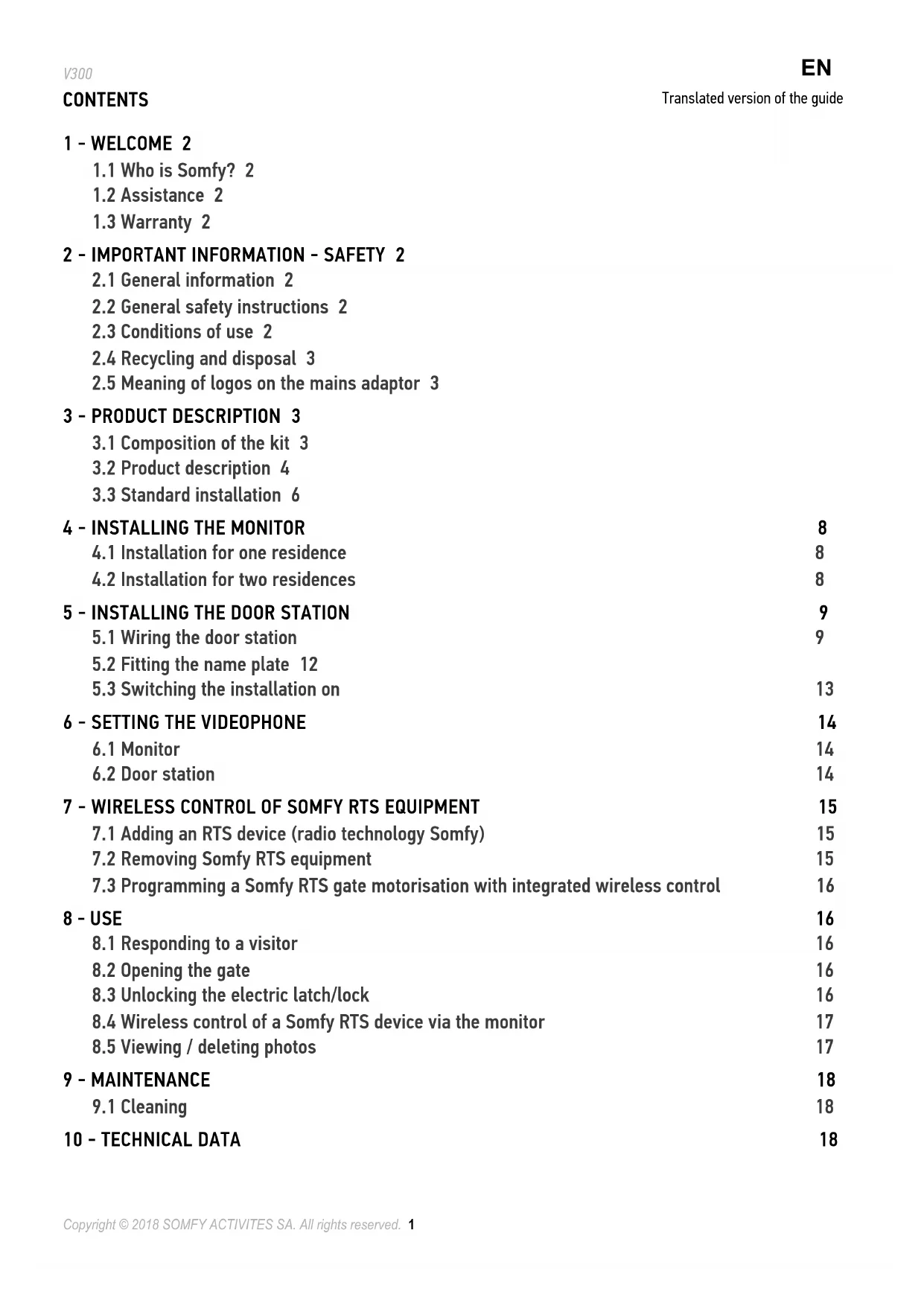 Translated version of the guide2 Copyright © 2018 SOMFY ACTIVITES SA. All rights reserved. V300