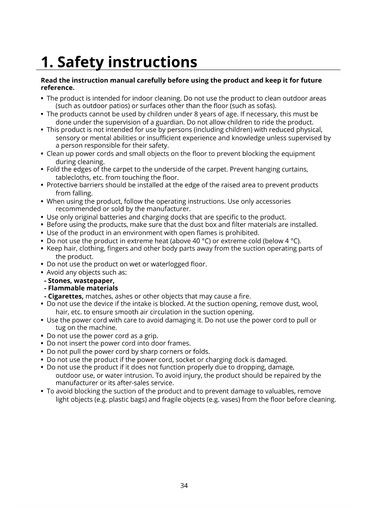 - To avoid blocking the suction of the product and to prevent damage to valuables, remove light objects (e.g. plastic bags) and fragile objects (e.g. vases) from the oor before cleaning.35