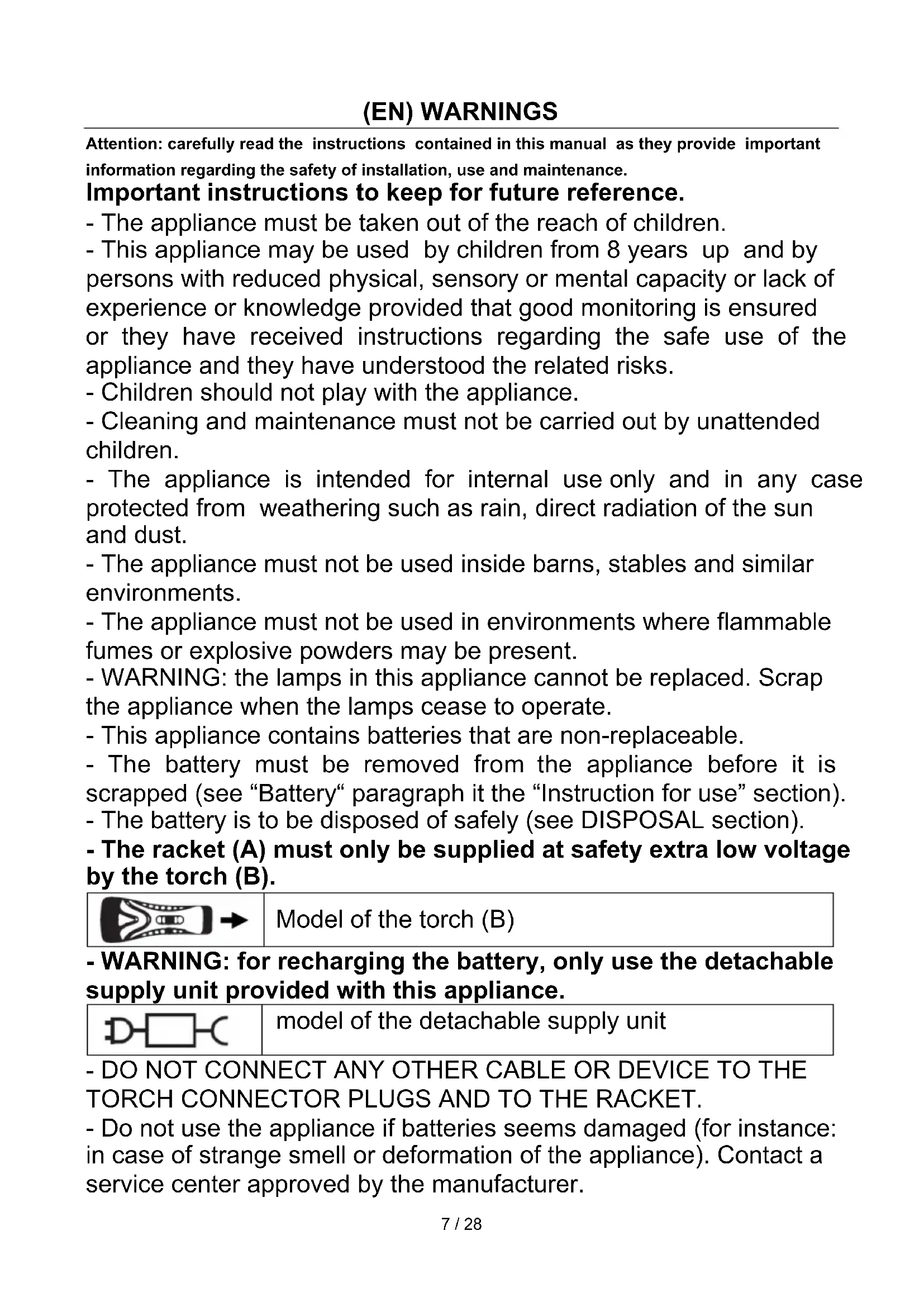 model of the detachable supply unit - DO NOT CONNECT ANY OTHER CABLE OR DEVICE TO THE TORCH CONNECTOR PLUGS AND TO THE RACKET. - Do not use the appliance if batteries seems damaged (for instance: in case of strange smell or deformation of the appliance). Contact a service center approved by the manufacturer.8 / 28 - DO NOT PUT ANY METALLIC OBJECTS OR PARTS OF THE BODY (f.i. fingers, hair etc.) THROUGH THE GRIDS.