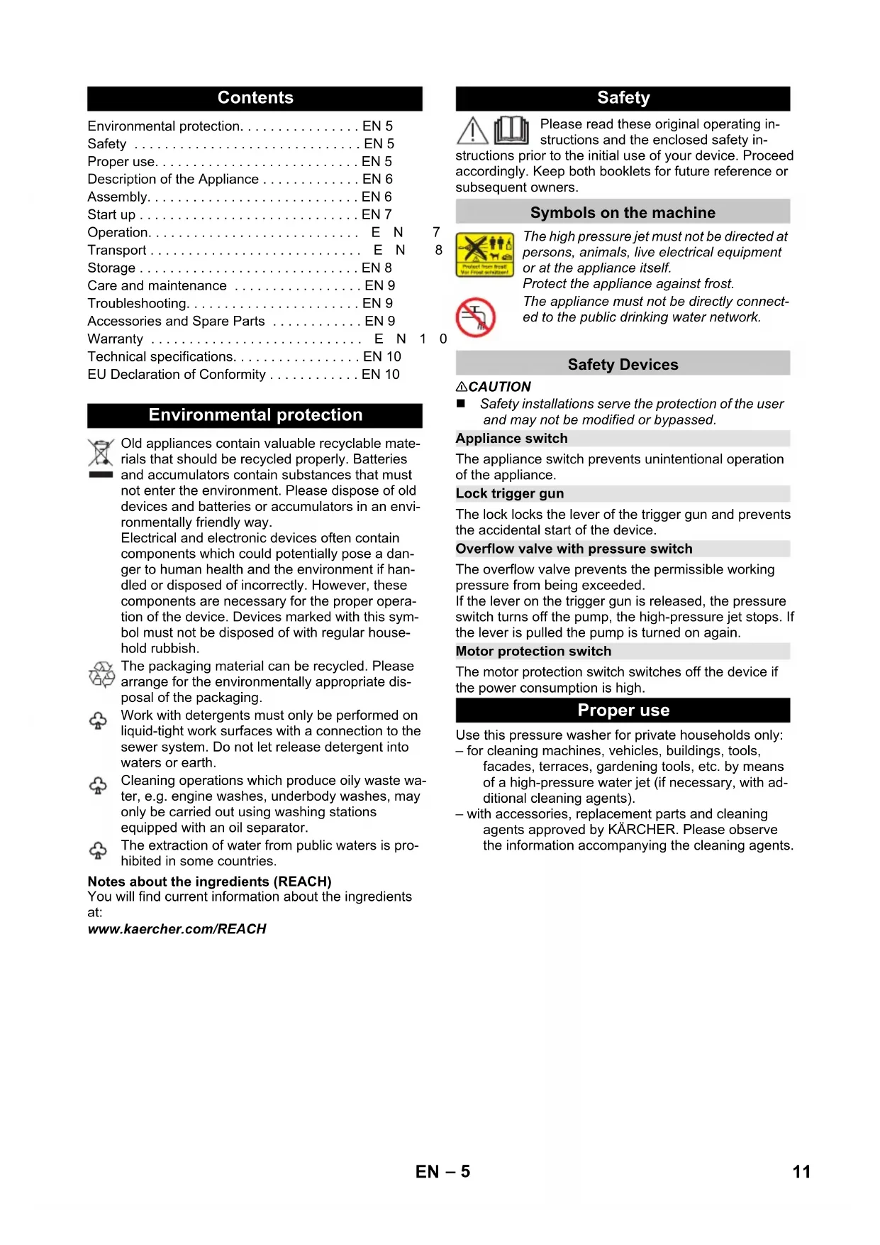 Check / replace the batteries Only use original accessories and spare parts, they en- sure the safe and trouble-free operation of the device. For information about accessories and spare parts, please visit www.kaercher.com. Frost protection Care and maintenance Clean the sieve in the water connection Changing the batteries of the trigger gun Troubleshooting Appliance is not running Appliance does not start, motor hums Pressure does not build up in the appliance Strong pressure fluctuations Appliance is leaking No detergent infeed No pressure indicator on the trigger gun Accessories and Spare Parts 15EN– 10 The warranty terms published by the relevant sales company are applicable in each country. We will repair potential failures of your appliance within the warranty period free of charge, provided that such failure is caused by faulty material or defects in manufacturing. In the event of a warranty claim please contact your dealer or the nearest authorized Customer Service centre. Please submit the proof of purchase. Addresses can be found under: www.kaercher.com/dealersearch We hereby declare that the machine described below complies with the relevant basic safety and health re- quirements of the EU Directives, both in its basic design and construction as well as in the version put into circu- lation by us. This declaration shall cease to be valid if the machine is modified without our prior approval. The signatories act on behalf of and with the authority of the company management. Documentation supervisor: S. Reiser Alfred Kärcher SE & Co. KG Alfred-Kärcher-Straße 28-40 71364 Winnenden (Germany) Tel.: +49 7195 14-0 Fax: +49 7195 14-2212 Warranty Technical specifications Electrical connection Voltage 230 1~50