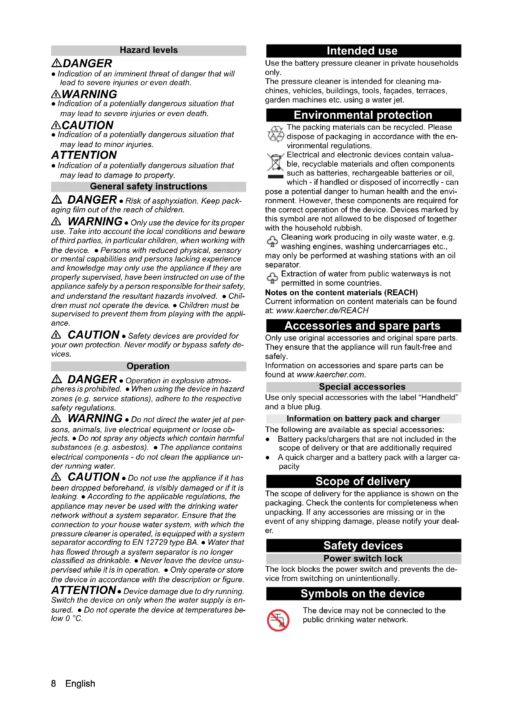- EU Declaration of Conformity Chairman of the Board of Management Director Regulatory Affairs & Certification H. Jenner S. Reiser8 English Hazard levels DANGER ● Indication of an imminent threat of danger that will lead to severe injuries or even death. 몇 WARNING ● Indication of a potentially dangerous situation that may lead to severe injuries or even death. 몇 CAUTION ● Indication of a potentially dangerous situation that may lead to minor injuries. ATTENTION ● Indication of a potentially dangerous situation that may lead to damage to property. General safety instructions DANGER ● Risk of asphyxiation. Keep pack- aging film out of the reach of children. 몇 WARNING ● Only use the device for its proper use. Take into account the local conditions and beware of third parties, in particular children, when working with the device. ● Persons with reduced physical, sensory or mental capabilities and persons lacking experience and knowledge may only use the appliance if they are properly supervised, have been instructed on use of the appliance safely by a person responsible for their safety, and understand the resultant hazards involved. ● Chil- dren must not operate the device. ● Children must be supervised to prevent them from playing with the appli- ance. 몇 CAUTION ● Safety devices are provided for your own protection. Never modify or bypass safety de- vices. Operation DANGER ● Operation in explosive atmos- pheres is prohibited. ● When using the device in hazard zones (e.g. service stations), adhere to the respective safety regulations. 몇 WARNING ● Do not direct the water jet at per- sons, animals, live electrical equipment or loose ob- jects. ● Do not spray any objects which contain harmful substances (e.g. asbestos). ● The appliance contains electrical components - do not clean the appliance un- der running water. 몇 CAUTION ● Do not use the appliance if it has been dropped beforehand, is visibly damaged or if it is leaking. ● According to the applicable regulations, the appliance may never be used with the drinking water network without a system separator. Ensure that the connection to your house water system, with which the pressure cleaner is operated, is equipped with a system separator according to EN 12729 type BA. ● Water that has flowed through a system separator is no longer classified as drinkable. ● Never leave the device unsu- pervised while it is in operation. ● Only operate or store the device in accordance with the description or figure. ATTENTION ● Device damage due to dry running. Switch the device on only when the water supply is en- sured. ● Do not operate the device at temperatures be- low 0 °C. Intended use Use the battery pressure cleaner in private households only. The pressure cleaner is intended for cleaning ma- chines, vehicles, buildings, tools, façades, terraces, garden machines etc. using a water jet. Environmental protection The packing materials can be recycled. Please dispose of packaging in accordance with the en- vironmental regulations. Electrical and electronic devices contain valua- ble, recyclable materials and often components such as batteries, rechargeable batteries or oil, which - if handled or disposed of incorrectly - can pose a potential danger to human health and the envi- ronment. However, these components are required for the correct operation of the device. Devices marked by this symbol are not allowed to be disposed of together with the household rubbish. Cleaning work producing in oily waste water, e.g. washing engines, washing undercarriages etc., may only be performed at washing stations with an oil separator. Extraction of water from public waterways is not permitted in some countries. Notes on the content materials (REACH) Current information on content materials can be found at: www.kaercher.de/REACH Accessories and spare parts Only use original accessories and original spare parts. They ensure that the appliance will run fault-free and safely. Information on accessories and spare parts can be found at www.kaercher.com. Special accessories Use only special accessories with the label “Handheld” and a blue plug. Information on battery pack and charger The following are available as special accessories: ● Battery packs/chargers that are not included in the scope of delivery or that are additionally required ● A quick charger and a battery pack with a larger ca- pacity Scope of delivery The scope of delivery for the appliance is shown on the packaging. Check the contents for completeness when unpacking. If any accessories are missing or in the event of any shipping damage, please notify your deal- er. Safety devices Power switch lock The lock blocks the power switch and prevents the de- vice from switching on unintentionally. Symbols on the device The device may not be connected to the public drinking water network.English 9 Description of the device The maximum amount of equipment is described in these operating instructions. Depending on the model used, there are differences in the scope of delivery (see packaging). For the illustrations, refer to the graphics page Illustration A 1 Flat jet nozzle for normal cleaning tasks 2 Nozzle release mechanism 3 Spray lance 4 Type plate 5 Battery pack unlocking button 6 Power switch lock 7 Power switch 8 Water connection with fine filter 9 Battery-powered pressure washer 10 Water connection coupling 11 **Garden hose (fabric reinforced, diameter at least 1/2 inch (13 mm), length at least 7.5 m, with com- mercially available quick coupling) 12 *Suction hose with coupling 13 * Battery Power 18/25 battery pack 14 *Standard Charger Battery Power 18 V 15 *Folding tank p. 11