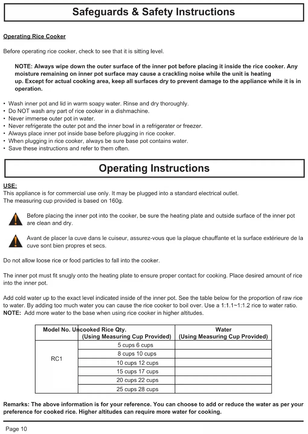 - Save these instructions and refer to them often. USE: This appliance is for commercial use only. It may be plugged into a standard electrical outlet. The measuring cup provided is based on 160g. Before placing the inner pot into the cooker, be sure the heating plate and outside surface of the inner pot are clean and dry. Avant de placer la cuve dans le cuiseur, assurez-vous que la plaque chauffante et la surface extérieure de la cuve sont bien propres et secs. Do not allow loose rice or food particles to fall into the cooker. The inner pot must t snugly onto the heating plate to ensure proper contact for cooking. Place desired amount of rice into the inner pot. Add cold water up to the exact level indicated inside of the inner pot. See the table below for the proportion of raw rice to water. By adding too much water you can cause the rice cooker to boil over. Use a 1:1.1~1:1.2 rice to water ratio. NOTE: Add more water to the base when using rice cooker in higher altitudes. Model No. Uncooked Rice Qty. (Using Measuring Cup Provided) Water (Using Measuring Cup Provided) RC1 5 cups 6 cups 8 cups 10 cups 10 cups 12 cups 15 cups 17 cups 20 cups 22 cups 25 cups 28 cups Remarks: The above information is for your reference. You can choose to add or reduce the water as per your preference for cooked rice. Higher altitudes can require more water for cooking. Safeguards & Safety Instructions Operating InstructionsPage 11 Operating Instructions