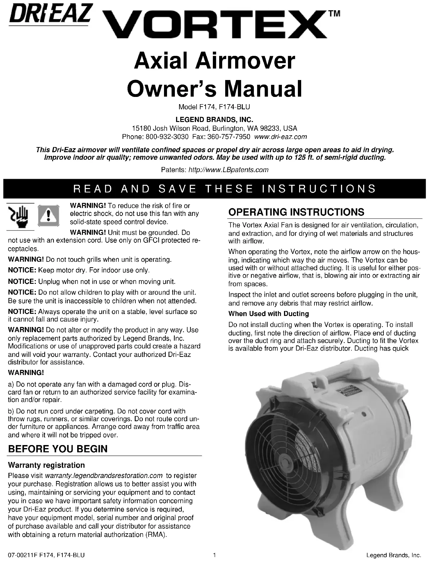 Warranty registration Please visit warranty.legendbrandsrestoration.com to register your purchase. Registration allows us to better assist you with using, maintaining or servicing your equipment and to contact you in case we have important safety information concerning your Dri-Eaz product. If you determine service is required, have your equipment model, serial number and original proof of purchase available and call your distributor for assistance with obtaining a return material authorization (RMA). OPERATING INSTRUCTIONS The Vortex Axial Fan is designed for air ventilation, circulation, and extraction, and for drying of wet materials and structures with airflow. When operating the Vortex, note the airflow arrow on the hous- ing, indicating which way the air moves. The Vortex can be used with or without attached ducting. It is useful for either pos- itive or negative airflow, that is, blowing air into or extracting air from spaces. Inspect the inlet and outlet screens before plugging in the unit, and remove any debris that may restrict airflow. When Used with Ducting Do not install ducting when the Vortex is operating. To install ducting, first note the direction of airflow. Place end of ducting over the duct ring and attach securely. Ducting to fit the Vortex is available from your Dri-Eaz distributor. Ducting has quick07-00211F F174, F174-BLU 2 Legend Brands, Inc. connect straps plus a snap-in ring used to fasten two sections of ducting together. Confined Space Ventilation Position the Vortex at least five feet away from the entry to the confined space. Place it upwind so that purged gases do not re-enter the unit. Make sure the the inlet is not blocked by a wall or other obstruction. Place the other end of the ducting in the confined space, an- gled so it points at an end wall. Keep it pointed at an end wall to prevent pockets of unmoving air, and to keep fresh air circu- lating to all locations. MAINTENANCE CAUTION: Internal repair procedures should be per- formed by a qualified technician from an authorized service center.