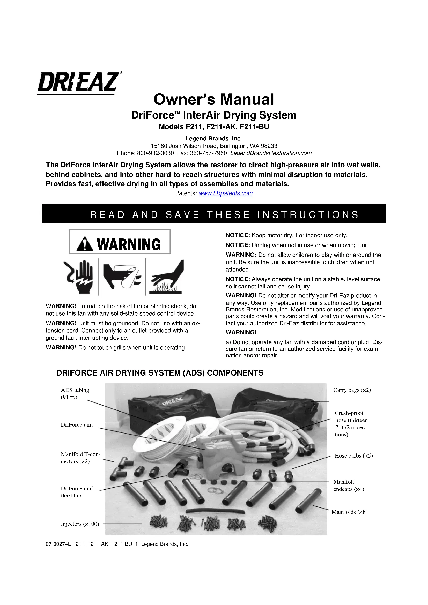 Safety ETL listed to UL 507 and CSA C22.2 No. 113 AIR DELIVERY SYSTEM (ADS) Crush-proof ADS tubing 91 ft. (28 m).of 1½ in. (3.8 cm) tubing. Pre-cut into thirteen 7 ft. (2 m) sections. Injector hole size Less than ¼ in. (6 mm) Flexible tubing 400 ft. (122 m) of ⅜ in. (0.375 mm) ID tubing Carrying/storage system 2 suitcase-style duffle bags with handle and wheels Drying modes Either positive or negative pressure Parts included 100 injectors, 8 manifolds (12 outlets each), 4 manifold endcaps, 4 coupler fittings, 2 hose clamps, 2 T-fittings, 13 hose assemblies with cuffs, 25 tube extender connections, 1 muffler.07-00274L F211, F211-AK, F211-BU 5 Legend Brands, Inc.