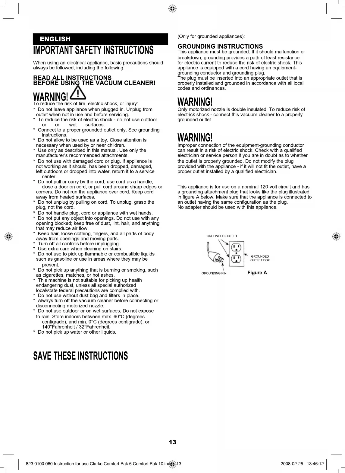 19:2 19:3 20:2 823 0100 060 Instruction for use Clarke Comfort Pak 6 Comfort Pak 10.indd 12823 0100 060 Instruction for use Clarke Comfort Pak 6 Comfort Pak 10.indd 12 2008-02-25 13:46:102008-02-25 13:46:1013 (Only for grounded appliances): GROUNDING INSTRUCTIONS This appliance must be grounded. If it should malfunction or breakdown, grounding provides a path of least resistance for electric current to reduce the risk of electric shock. This appliance is equipped with a cord having an equipment- grounding conductor and grounding plug. The plug must be inserted into an appropriate outlet that is properly installed and grounded in accordance with all local codes and ordinances. WARNING! Only motorized nozzle is double insulated. To reduce risk of electrick shock - connect this vacuum cleaner to a properly grounded outlet. WARNING! Improper connection of the equipment-grounding conductor can result in a risk of electric shock. Check with a qualified electrician or service person if you are in doubt as to whether the outlet is properly grounded. Do not modify the plug provided with the appliance - if it will not fit the outlet, have a proper outlet installed by a qualified electrician. This appliance is for use on a nominal 120-volt circuit and has a grounding attachment plug that looks like the plug illustrated in figure A below. Make sure that the appliance is connected to an outlet having the same configuration as the plug. No adapter should be used with this appliance.
