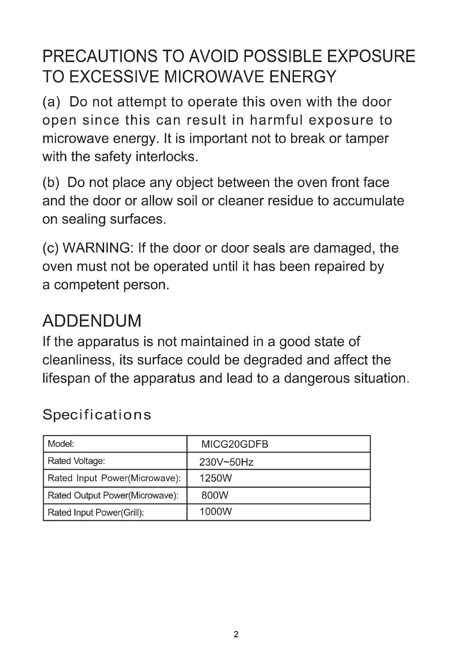 Specifications Model: Rated Voltage: Rated Input Power(Microwave): Rated Output Power(Microwave): Rated Input Power(Grill): 230V~50Hz 1250W 1000W 800W MICG20GDFB