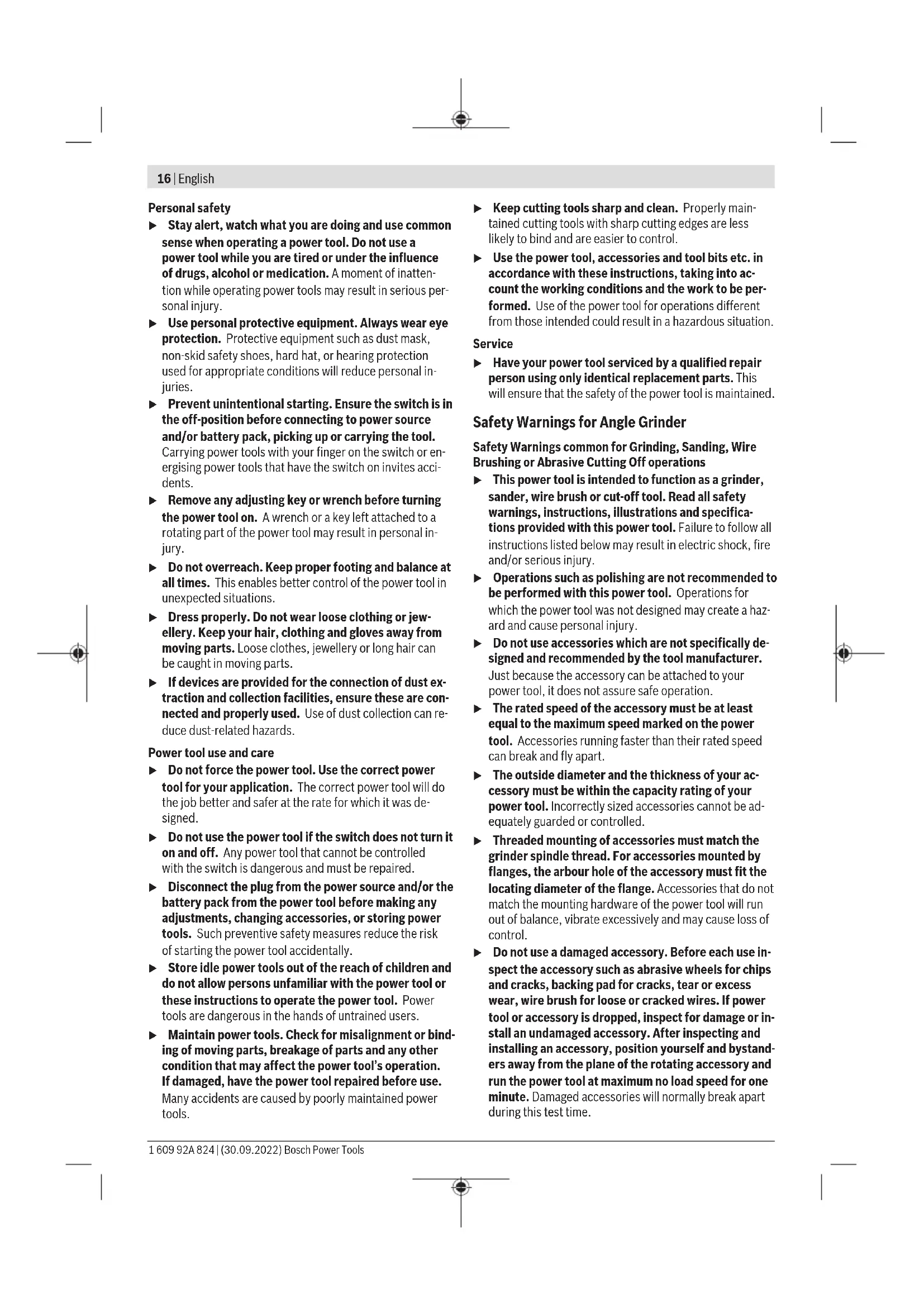 äußeren Abmessung größer als 25cm sind, im Einzel- handelsgeschäft oder in unmittelbarer Nähe hierzu un- entgeltlich zurückzunehmen; die Rücknahme darf nicht an den Kauf eines Elektro- oder Elektronikgerätes ge- knüpft werden und ist auf drei Altgeräte pro Geräteart beschränkt. Der Vertreiber hat beim Abschluss des Kaufvertrags für das neue Elektro- oder Elektronikgerät den Endnutzer über die Möglichkeit zur unentgeltlichen Rückgabe bzw. Abholung des Altgeräts zu informieren und den Endnutzer nach seiner Absicht zu befragen, ob bei der Auslieferung des neuen Ge- räts ein Altgerät zurückgegeben wird. Dies gilt auch bei Vertrieb unter Verwendung von Fernkom- munikationsmitteln, wenn die Lager- und Versandflächen für Elektro- und Elektronikgeräte mindestens 400m² betragen oder die gesamten Lager- und Versandflächen mindestens 800m² betragen, wobei die unentgeltliche Abholung auf Elektro- und Elektronikgeräte der Kategorien 1 (Wärmeüber- träger), 2 (Bildschirmgeräte) und 4 (Großgeräte mit mindes- tens einer äußeren Abmessung über 50cm) beschränkt ist. Für alle übrigen Elektro- und Elektronikgeräte muss der Ver- treiber geeignete Rückgabemöglichkeiten in zumutbarer Ent- fernung zum jeweiligen Endnutzer gewährleisten; das gilt auch für Altgeräte, die in keiner äußeren Abmessung größer als 25cm sind, die der Endnutzer zurückgeben will, ohne ein neues Gerät zu kaufen. English Safety Instructions General Power Tool Safety Warnings WARNING Read all safety warnings and all in- structions. Failure to follow the warnings and instructions may result in electric shock, fire and/or serious injury. Save all warnings and instructions for future reference. The term "power tool" in the warnings refers to your mains- operated (corded) power tool or battery-operated (cord- less) power tool. Work area safety u Keep work area clean and well lit. Cluttered or dark areas invite accidents. u Do not operate power tools in explosive atmospheres, such as in the presence of flammable liquids, gases or dust. Power tools create sparks which may ignite the dust or fumes. u Keep children and bystanders away while operating a power tool. Distractions can cause you to lose control. Electrical safety u Power tool plugs must match the outlet. Never modify the plug in any way. Do not use any adapter plugs with earthed (grounded) power tools. Unmodified plugs and matching outlets will reduce risk of electric shock. u Avoid body contact with earthed or grounded sur- faces, such as pipes, radiators, ranges and refrigerat- ors. There is an increased risk of electric shock if your body is earthed or grounded. u Do not expose power tools to rain or wet conditions. Water entering a power tool will increase the risk of elec- tric shock. u Do not abuse the cord. Never use the cord for carry- ing, pulling or unplugging the power tool. Keep cord away from heat, oil, sharp edges or moving parts. Damaged or entangled cords increase the risk of electric shock. u When operating a power tool outdoors, use an exten- sion cord suitable for outdoor use. Use of a cord suit- able for outdoor use reduces the risk of electric shock.. u If operating a power tool in a damp location is un- avoidable, use a residual current device (RCD) protec- ted supply. Use of an RCD reduces the risk of electric shock. Bosch Power Tools 1 609 92A 824 | (30.09.2022)16 | English Personal safety u Stay alert, watch what you are doing and use common sense when operating a power tool. Do not use a power tool while you are tired or under the influence of drugs, alcohol or medication. A moment of inatten- tion while operating power tools may result in serious per- sonal injury. u Use personal protective equipment. Always wear eye protection. Protective equipment such as dust mask, non-skid safety shoes, hard hat, or hearing protection used for appropriate conditions will reduce personal in- juries. u Prevent unintentional starting. Ensure the switch is in the off-position before connecting to power source and/or battery pack, picking up or carrying the tool. Carrying power tools with your finger on the switch or en- ergising power tools that have the switch on invites acci- dents. u Remove any adjusting key or wrench before turning the power tool on. A wrench or a key left attached to a rotating part of the power tool may result in personal in- jury. u Do not overreach. Keep proper footing and balance at all times. This enables better control of the power tool in unexpected situations. u Dress properly. Do not wear loose clothing or jew- ellery. Keep your hair, clothing and gloves away from moving parts. Loose clothes, jewellery or long hair can be caught in moving parts. u If devices are provided for the connection of dust ex- traction and collection facilities, ensure these are con- nected and properly used. Use of dust collection can re- duce dust-related hazards. Power tool use and care u Do not force the power tool. Use the correct power tool for your application. The correct power tool will do the job better and safer at the rate for which it was de- signed. u Do not use the power tool if the switch does not turn it on and off. Any power tool that cannot be controlled with the switch is dangerous and must be repaired. u Disconnect the plug from the power source and/or the battery pack from the power tool before making any adjustments, changing accessories, or storing power tools. Such preventive safety measures reduce the risk of starting the power tool accidentally. u Store idle power tools out of the reach of children and do not allow persons unfamiliar with the power tool or these instructions to operate the power tool. Power tools are dangerous in the hands of untrained users. u Maintain power tools. Check for misalignment or bind- ing of moving parts, breakage of parts and any other condition that may affect the power tool’s operation. If damaged, have the power tool repaired before use. Many accidents are ca