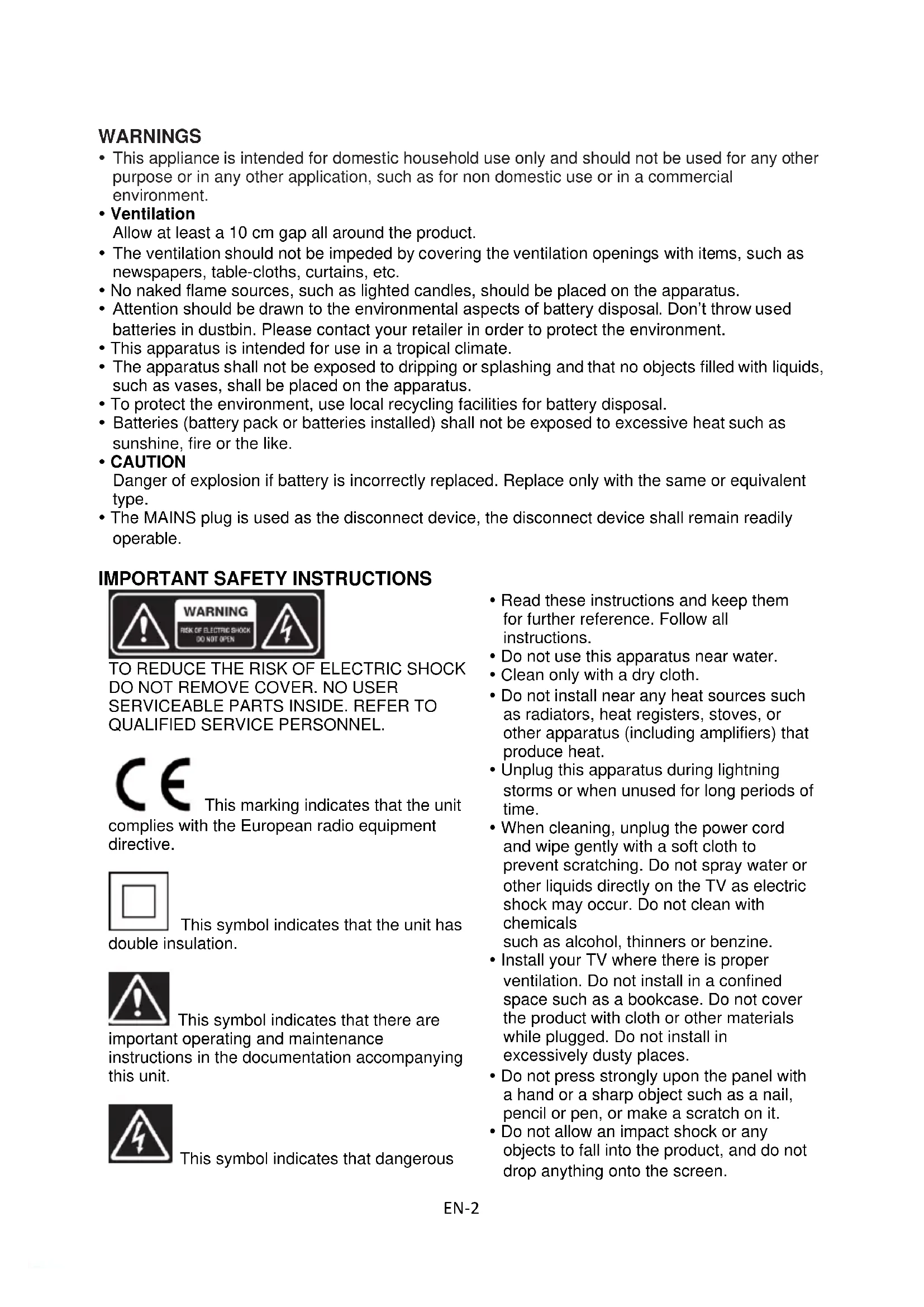 QUALIFIED SERVICE PERSONNEL. This marking indicates that the unit complies with the European radio equipment directive. This symbol indicates that the unit has double insulation. This symbol indicates that there are important operating and maintenance instructions in the documentation accompanying this unit. This symbol indicates that dangerous Read these instructions and keep them for further reference. Follow all instructions. Do not use this apparatus near water. Clean only with a dry cloth. Do not install near any heat sources such as radiators, heat registers, stoves, or other apparatus (including amplifiers) that produce heat. Unplug this apparatus during lightning storms or when unused for long periods of time. When cleaning, unplug the power cord and wipe gently with a soft cloth to prevent scratching. Do not spray water or other liquids directly on the TV as electric shock may occur. Do not clean with chemicals such as alcohol, thinners or benzine. Install your TV where there is proper ventilation. Do not install in a confined space such as a bookcase. Do not cover the product with cloth or other materials while plugged. Do not install in excessively dusty places. Do not press strongly upon the panel with a hand or a sharp object such as a nail, pencil or pen, or make a scratch on it. Do not allow an impact shock or any objects to fall into the product, and do not drop anything onto the screen.EN-3 voltage constituting a risk of electric shock is present within this unit. PRODUCT DESCRIPTION Front and Side Views
