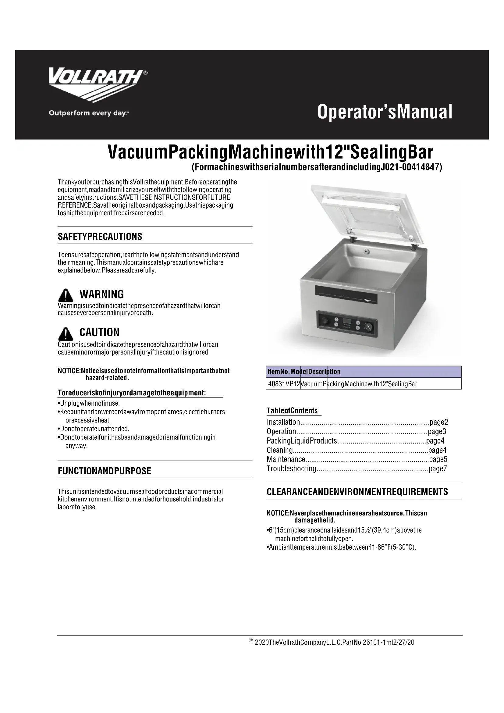 Serviceable parts are available on Vollrath.com. To avoid serious injury or damage, never attempt to repair the unit or replace a damaged power cord yourself. Do not send units directly to The Vollrath Company LLC. Please contact Vollrath Technical Services for instructions. When contacting Vollrath Technical Services, please be ready with the item number, model number (if applicable), serial number, and proof of purchase showing the date the unit was purchased. WARRANTY STATEMENT FOR THE VOLLRATH CO. L.L.C. This warranty does not apply to products purchased for personal, family or household use, and The Vollrath Company LLC does not offer a written warranty to purchasers for such uses. The Vollrath Company LLC warrants the products it manufactures or distributes against defects in materials and workmanship as specifically described in our full warranty statement. In all cases, the warranty runs from the date of the end user’s original purchase date found on the receipt. Any damages from improper use, abuse, modification or damage resulting from improper packaging during return shipment for warranty repair will not be covered under warranty. For complete warranty information, product registration and new product announcement, visit www.vollrath.com.Manuel d'utilisation Appareil à emballer sous vide avec barre de soudage 12" (30,5 cm) (Pour les machines avec des numéros de série après et y compris J021-00414847)