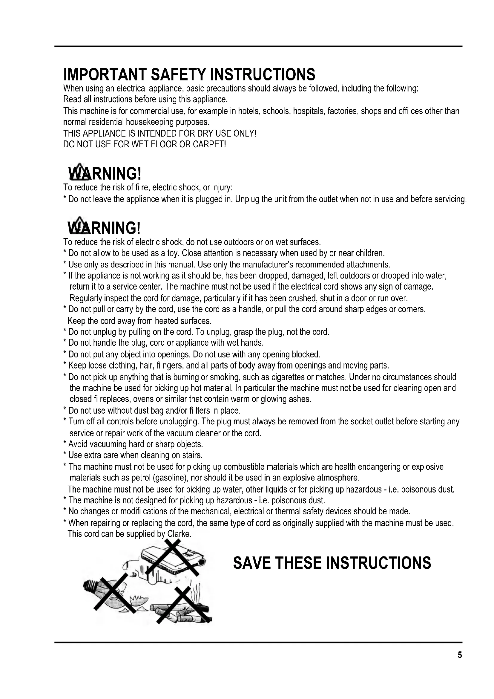When using an electrical appliance, basic precautions should always be followed, including the following: Read all instructions before using this appliance. This machine is for commercial use, for example in hotels, schools, hospitals, factories, shops and offi ces other than normal residential housekeeping purposes. THIS APPLIANCE IS INTENDED FOR DRY USE ONLY! DO NOT USE FOR WET FLOOR OR CARPET! WARNING! To reduce the risk of fi re, electric shock, or injury: