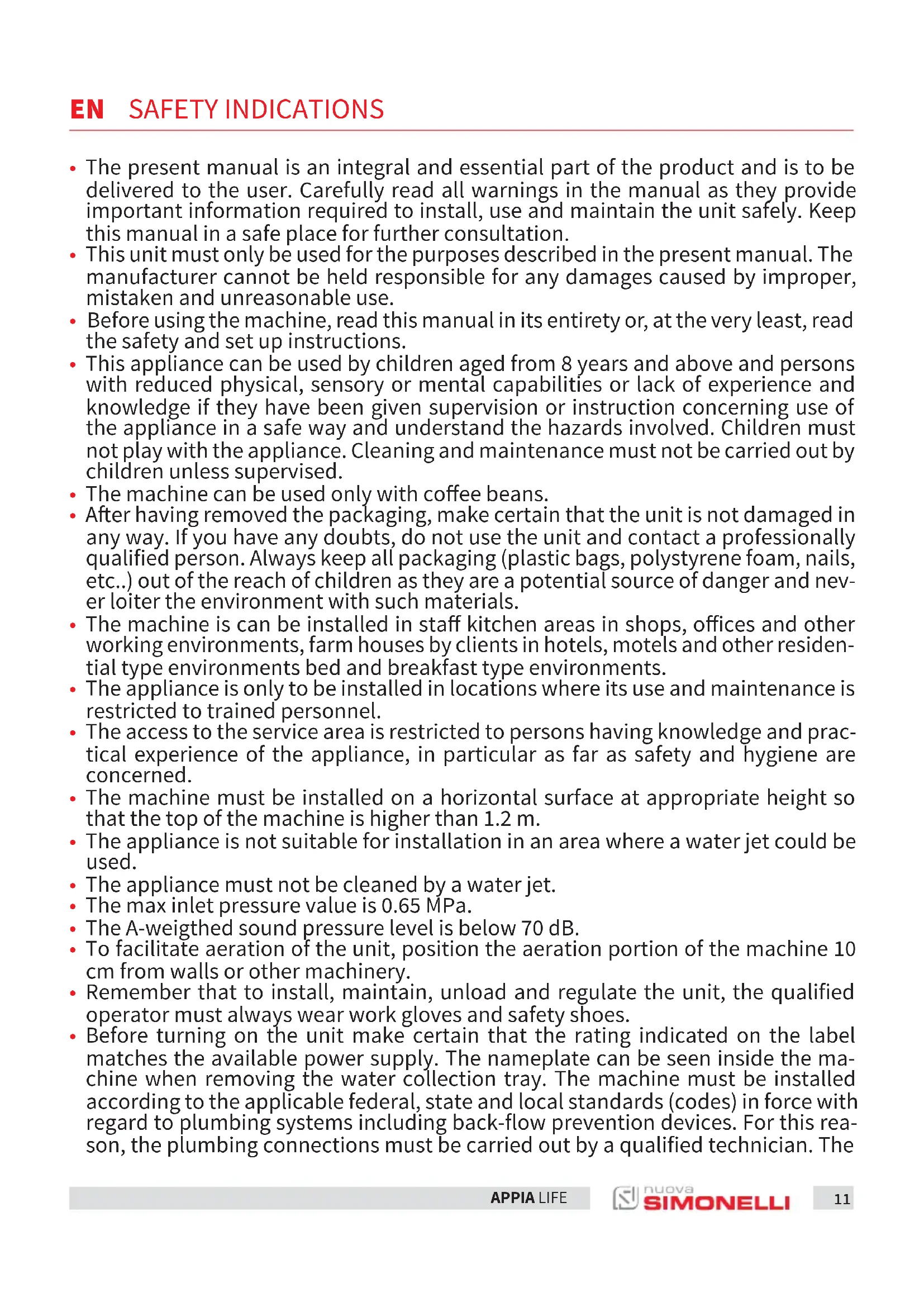 USER MANUAL Appia Life NUOVA SIMONELLI