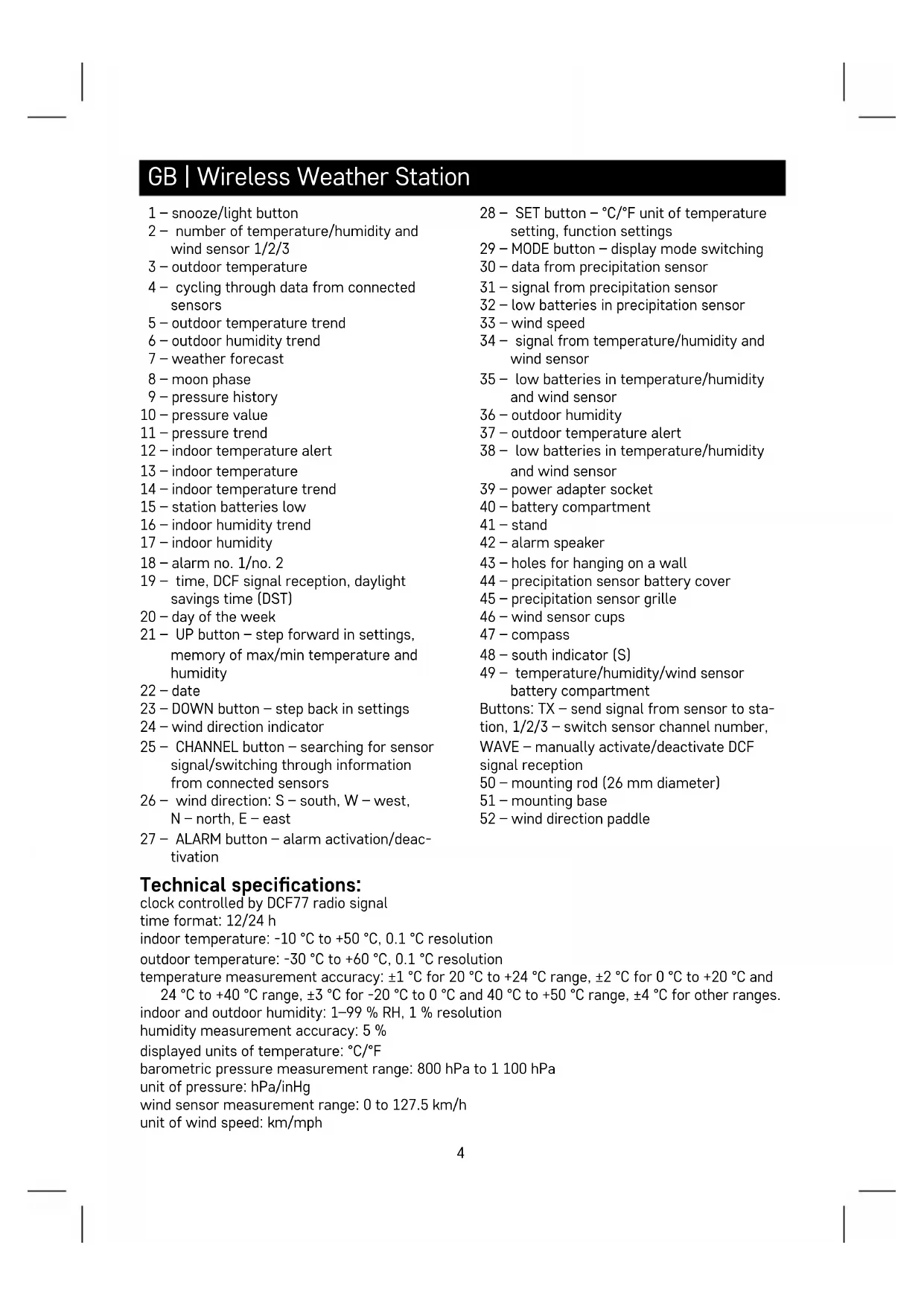 GB | Wireless Weather Station 1 – snooze/light button 2 – number of temperature/humidity and wind sensor 1/2/3 3 – outdoor temperature 4 – cycling through data from connected sensors 5 – outdoor temperature trend 6 – outdoor humidity trend 7 – weather forecast 8 – moon phase 9 – pressure history 10 – pressure value 11 – pressure trend 12 – indoor temperature alert 13 – indoor temperature 14 – indoor temperature trend 15 – station batteries low 16 – indoor humidity trend 17 – indoor humidity 18 – alarm no. 1/no. 2 19 – time, DCF signal reception, daylight savings time (DST) 20 – day of the week 21 – UP button – step forward in settings, memory of max/min temperature and humidity 22 – date 23 – DOWN button – step back in settings 24 – wind direction indicator 25 – CHANNEL button – searching for sensor signal/switching through information from connected sensors 26 – wind direction: S – south, W – west, N – north, E – east 27 – ALARM button – alarm activation/deac- tivation 28 – SET button – °C/°F unit of temperature setting, function settings 29 – MODE button – display mode switching 30 – data from precipitation sensor 31 – signal from precipitation sensor 32 – low batteries in precipitation sensor 33 – wind speed 34 – signal from temperature/humidity and wind sensor 35 – low batteries in temperature/humidity and wind sensor 36 – outdoor humidity 37 – outdoor temperature alert 38 – low batteries in temperature/humidity and wind sensor 39 – power adapter socket 40 – battery compartment 41 – stand 42 – alarm speaker 43 – holes for hanging on a wall 44 – precipitation sensor battery cover 45 – precipitation sensor grille 46 – wind sensor cups 47 – compass 48 – south indicator (S) 49 – temperature/humidity/wind sensor battery compartment Buttons: TX – send signal from sensor to sta- tion, 1/2/3 – switch sensor channel number, WAVE – manually activate/deactivate DCF signal reception 50 – mounting rod (26 mm diameter) 51 – mounting base 52 – wind direction paddle Technical specications: clock controlled by DCF77 radio signal time format: 12/24 h indoor temperature: -10°C to +50°C, 0.1°C resolution outdoor temperature: -30°C to +60°C, 0.1°C resolution temperature measurement accuracy: ±1°C for 20°C to +24°C range, ±2°C for 0°C to +20°C and 24°C to +40°C range, ±3°C for -20°C to 0°C and 40°C to +50°C range, ±4°C for other ranges. indoor and outdoor humidity: 1–99 % RH, 1 % resolution humidity measurement accuracy: 5 % displayed units of temperature: °C/°F barometric pressure measurement range: 800 hPa to 1 100 hPa unit of pressure: hPa/inHg wind sensor measurement range: 0 to 127.5 km/h unit of wind speed: km/mph5 precipitation sensor measurement range: 0 to 2,999 mm unit of precipitation: mm/inch radio signal range: to 100 m in open area number of sensors which can be connected: max. 3 (temperature/humidity/wind sensor), max. 1 (precipitation sensor) wireless sensor: transmission frequency 433 MHz, 10 mW e.r.p. max. station power supply: 3× 1.5 V AAA batteries (not included) adapter AC 230 V/DC 5 V, 300 mA (included) temperature/humidity/wind sensor power supply: 4× 1.5 V AA (not included) precipitation sensor power supply: 2× 1.5 V AA (not included) station dimensions and weight: 17 × 192 × 127 mm, 364 g temperature/humidity/wind sensor dimensions and weight: 275 × 135 × 310 mm, 377 g (without batteries) precipitation sensor dimensions and weight: 100 × 106 × 166 mm, 220 g (without batteries) Getting Started/Installation