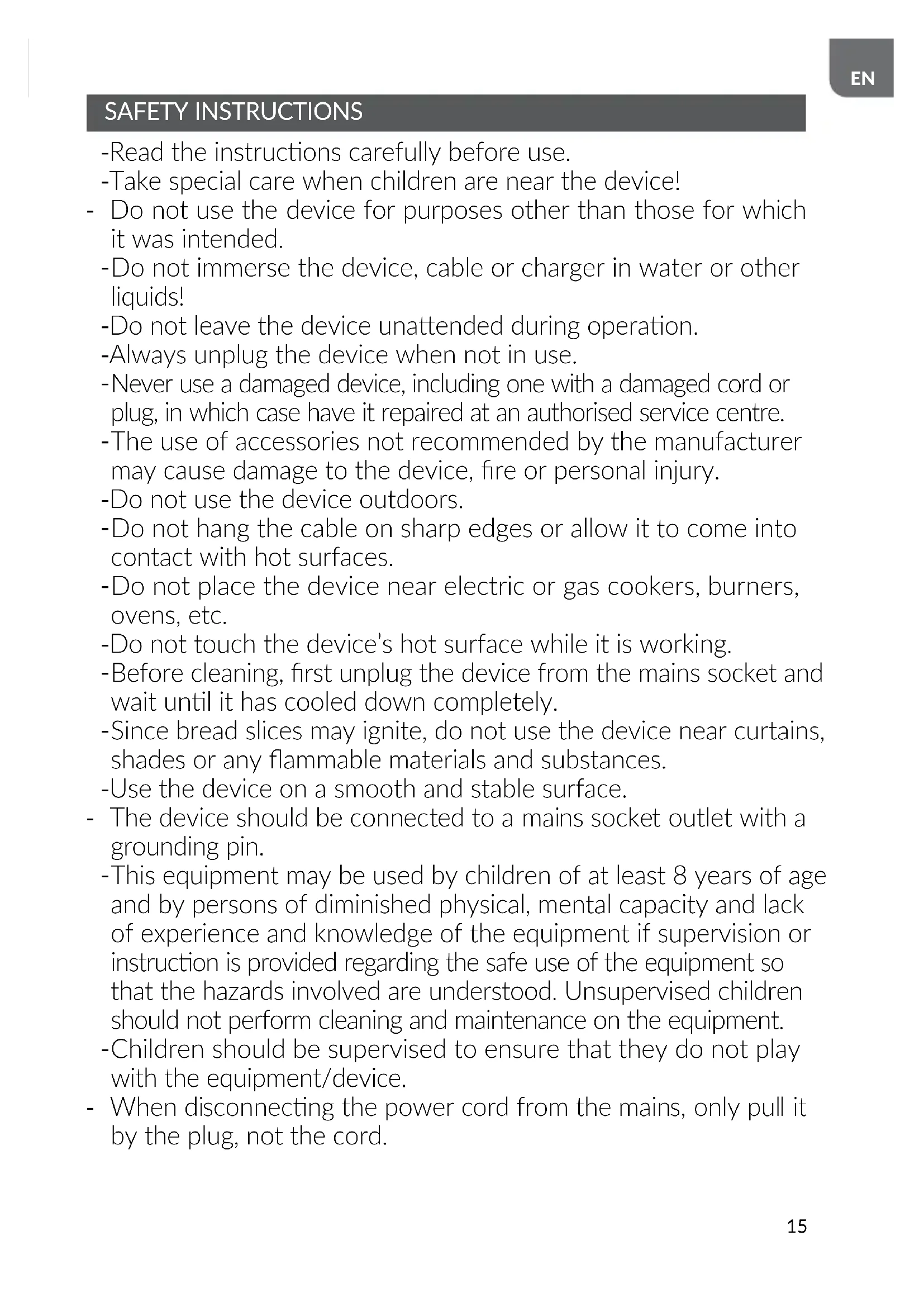 Since bread slices may ignite, do not use the device near curtains, shades or any ammable materials and substances. - Use the device on a smooth and stable surface. - The device should be connected to a mains socket outlet with a grounding pin.