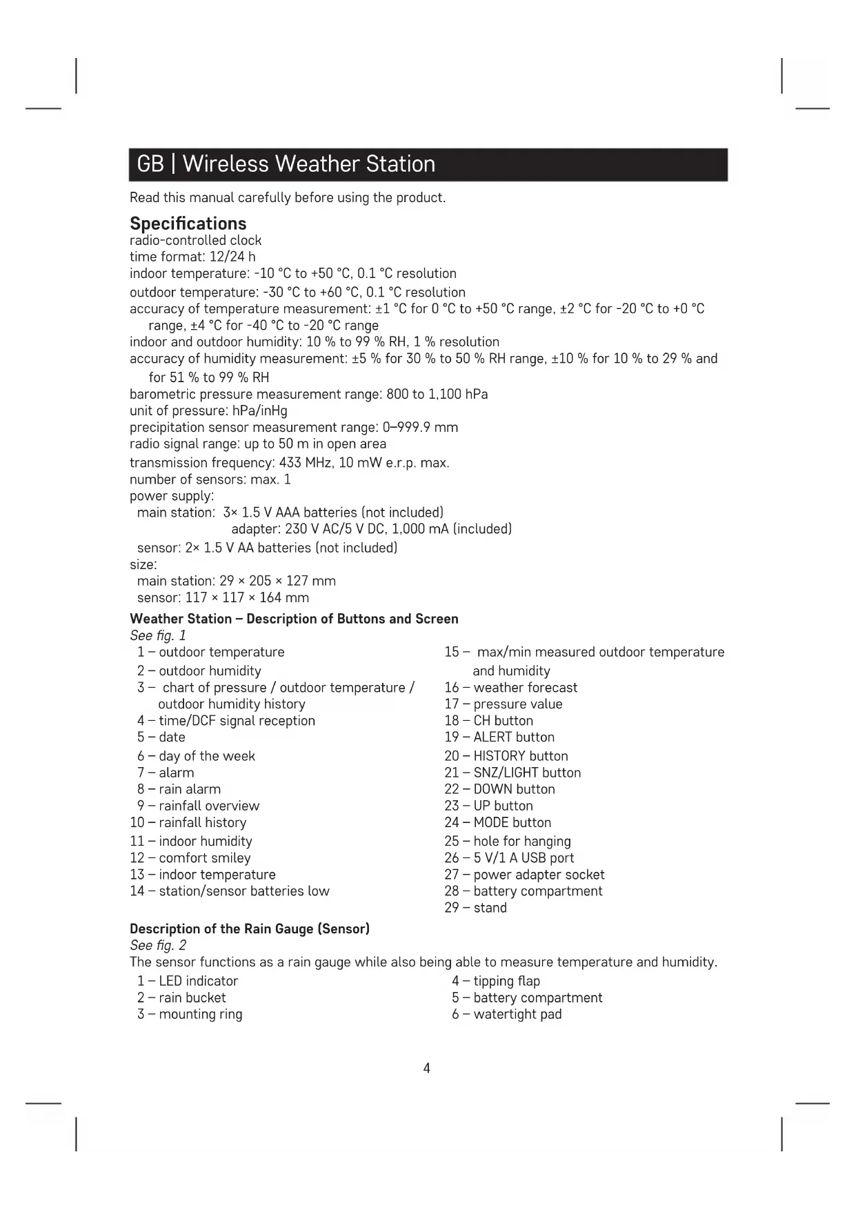 GB | Wireless Weather Station Read this manual carefully before using the product. Specications radio-controlled clock time format: 12/24 h indoor temperature: -10°C to +50°C, 0.1°C resolution outdoor temperature: -30°C to +60°C, 0.1°C resolution accuracy of temperature measurement: ±1°C for 0°C to +50°C range, ±2°C for -20°C to +0°C range, ±4°C for -40°C to -20°C range indoor and outdoor humidity: 10% to 99% RH, 1% resolution accuracy of humidity measurement: ±5% for 30% to 50% RH range, ±10% for 10% to 29% and for 51% to 99% RH barometric pressure measurement range: 800 to 1,100 hPa unit of pressure: hPa/inHg precipitation sensor measurement range: 0–999.9 mm radio signal range: up to 50 m in open area transmission frequency: 433 MHz, 10 mW e.r.p. max. number of sensors: max. 1 power supply: main station: 3× 1.5 V AAA batteries (not included) adapter: 230 V AC/5 V DC, 1,000 mA (included) sensor: 2× 1.5 V AA batteries (not included) size: main station: 29 × 205 × 127 mm sensor: 117 × 117 × 164 mm Weather Station – Description of Buttons and Screen See g. 1 1 – outdoor temperature 2 – outdoor humidity 3 – chart of pressure / outdoor temperature / outdoor humidity history 4 – time/DCF signal reception 5 – date 6 – day of the week 7 – alarm 8 – rain alarm 9 – rainfall overview 10 – rainfall history 11 – indoor humidity 12 – comfort smiley 13 – indoor temperature 14 – station/sensor batteries low 15 – max/min measured outdoor temperature and humidity 16 – weather forecast 17 – pressure value 18 – CH button 19 – ALERT button 20 – HISTORY button 21 – SNZ/LIGHT button 22 – DOWN button 23 – UP button 24 – MODE button 25 – hole for hanging 26 – 5 V/1 A USB port 27 – power adapter socket 28 – battery compartment 29 – stand Description of the Rain Gauge (Sensor) See g. 2 The sensor functions as a rain gauge while also being able to measure temperature and humidity. 1 – LED indicator 2 – rain bucket 3 – mounting ring 4 – tipping ap 5 – battery compartment 6 – watertight pad5 Assembly/Installation of the Rain Gauge (Sensor)
