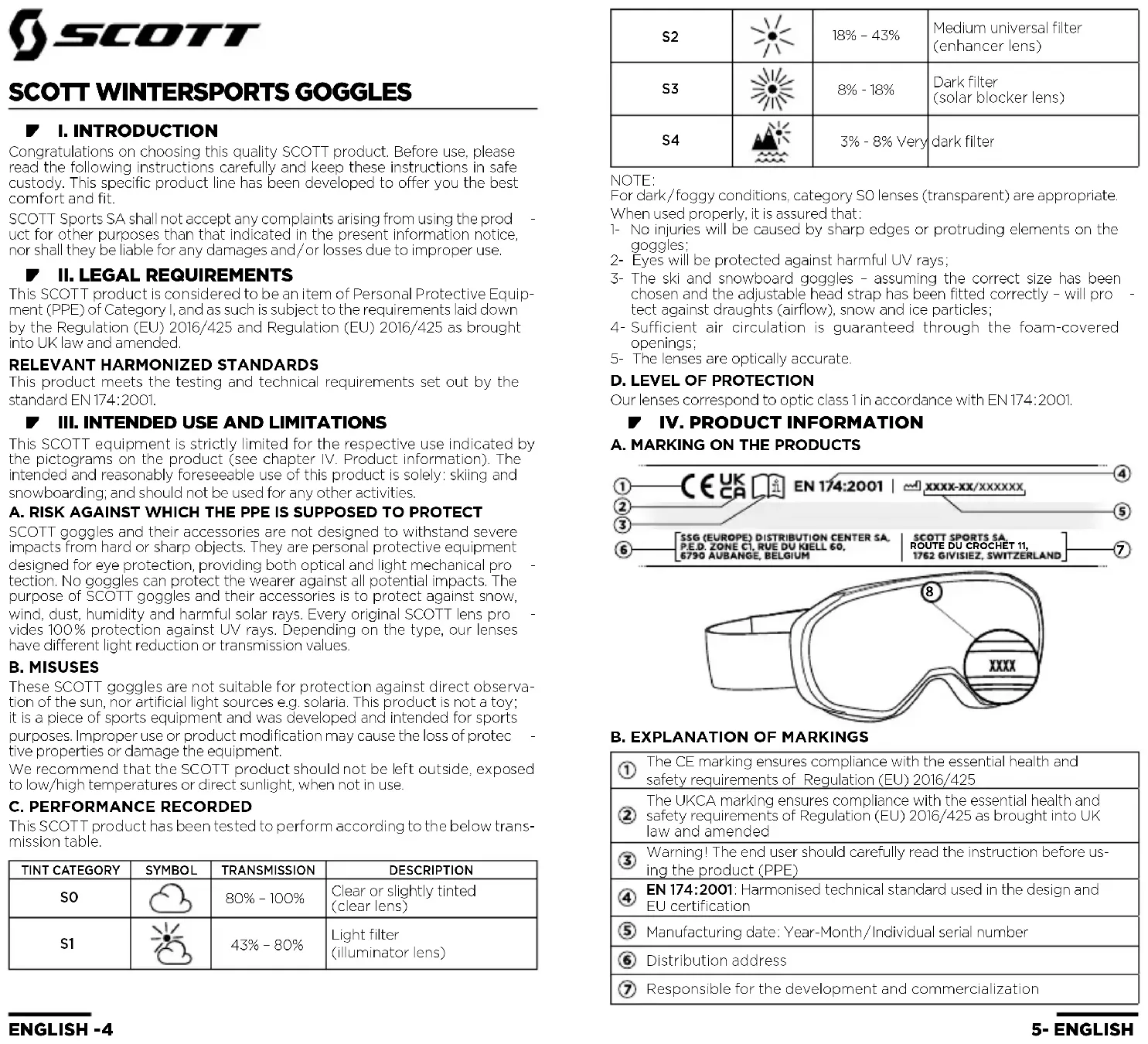 vides 100 % protection against UV rays. Depending on the type, our lenses have different light reduction or transmission values. B. MISUSES These SCOTT goggles are not suitable for protection against direct observa- tion of the sun, nor artificial light sources e.g. solaria. This product is not a toy ; it is a piece of sports equipment and was developed and intended for sports purposes. Improper use or product modification may cause the loss of protec