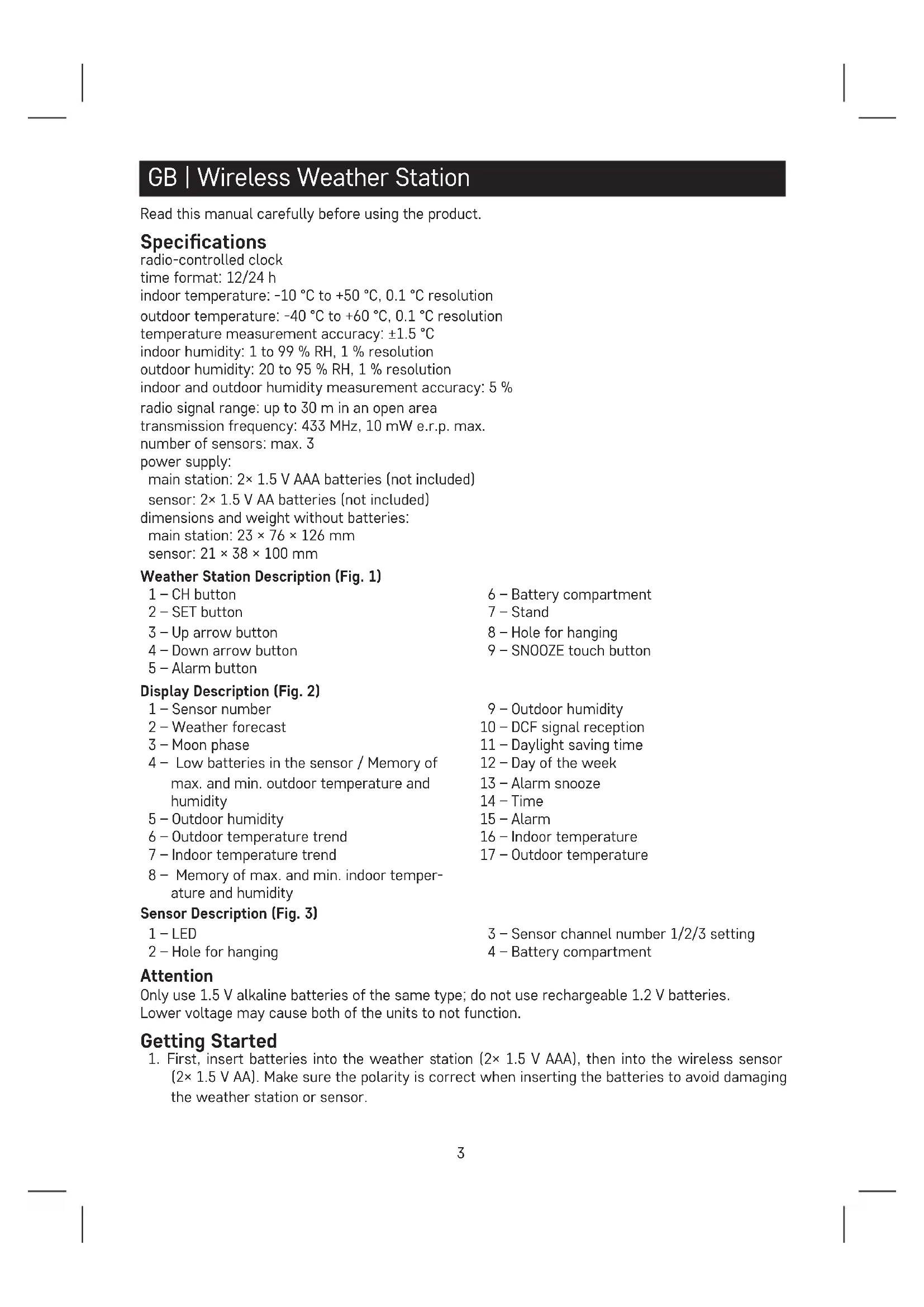 GB | Wireless Weather Station Read this manual carefully before using the product. Specications radio-controlled clock time format: 12/24 h indoor temperature: -10 °C to +50 °C, 0.1 °C resolution outdoor temperature: -40 °C to +60 °C, 0.1 °C resolution temperature measurement accuracy: ±1.5 °C indoor humidity: 1 to 99 % RH, 1 % resolution outdoor humidity: 20 to 95 % RH, 1 % resolution indoor and outdoor humidity measurement accuracy: 5 % radio signal range: up to 30 m in an open area transmission frequency: 433 MHz, 10 mW e.r.p. max. number of sensors: max. 3 power supply: main station: 2× 1.5 V AAA batteries (not included) sensor: 2× 1.5 V AA batteries (not included) dimensions and weight without batteries: main station: 23 × 76 × 126 mm sensor: 21 × 38 × 100 mm Weather Station Description (Fig. 1) 1 – CH button 2 – SET button 3 – Up arrow button 4 – Down arrow button 5 – Alarm button 6 – Battery compartment 7 – Stand 8 – Hole for hanging 9 – SNOOZE touch button Display Description (Fig. 2) 1 – Sensor number 2 – Weather forecast 3 – Moon phase 4 – Low batteries in the sensor / Memory of max. and min. outdoor temperature and humidity 5 – Outdoor humidity 6 – Outdoor temperature trend 7 – Indoor temperature trend 8 – Memory of max. and min. indoor temper- ature and humidity 9 – Outdoor humidity 10 – DCF signal reception 11 – Daylight saving time 12 – Day of the week 13 – Alarm snooze 14 – Time 15 – Alarm 16 – Indoor temperature 17 – Outdoor temperature Sensor Description (Fig. 3) 1 – LED 2 – Hole for hanging 3 – Sensor channel number 1/2/3 setting 4 – Battery compartment Attention Only use 1.5 V alkaline batteries of the same type; do not use rechargeable 1.2 V batteries. Lower voltage may cause both of the units to not function. Getting Started