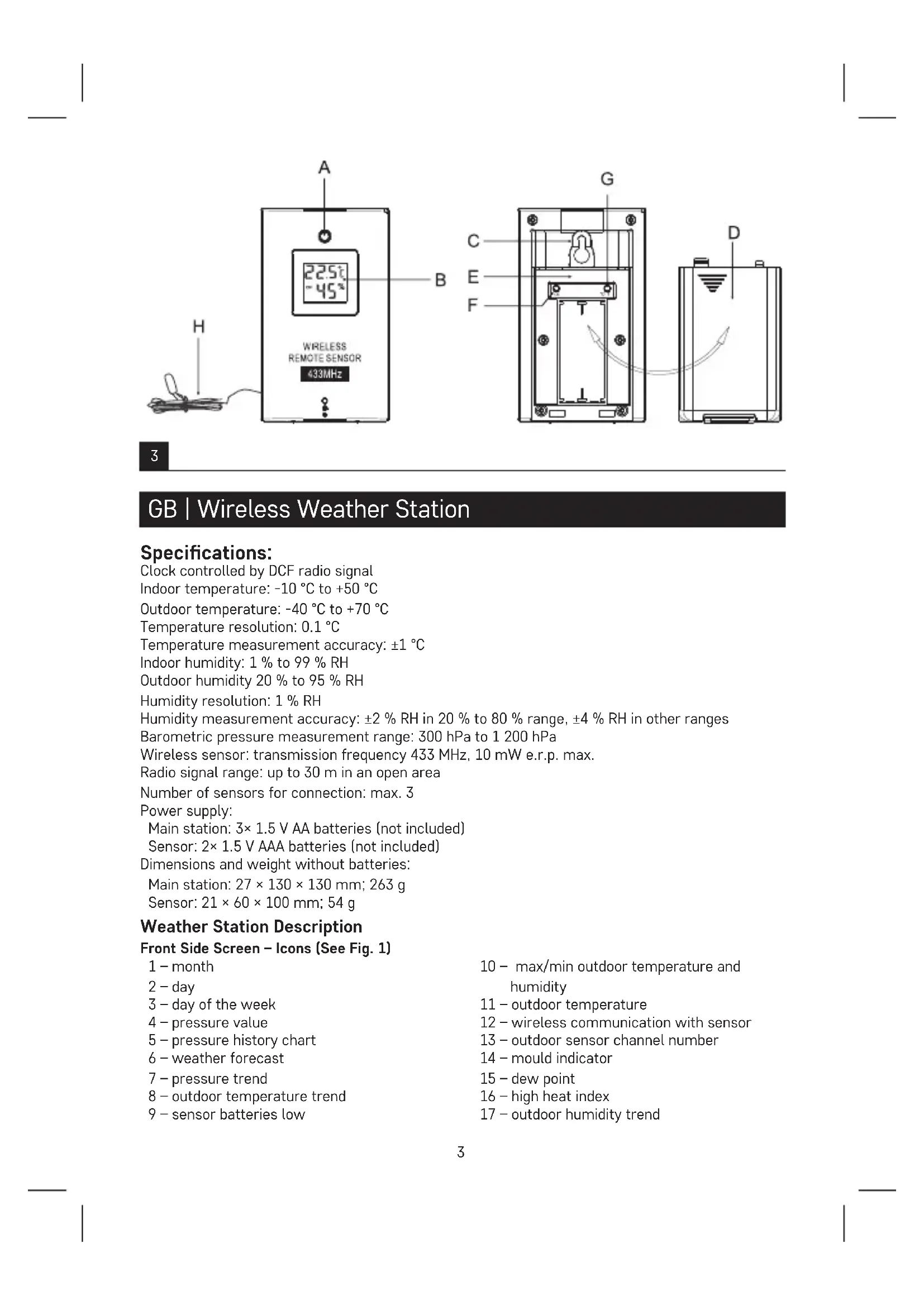 GB | Wireless Weather Station Specications: Clock controlled by DCF radio signal Indoor temperature: -10 °C to +50 °C Outdoor temperature: -40 °C to +70 °C Temperature resolution: 0.1 °C Temperature measurement accuracy: ±1 °C Indoor humidity: 1 % to 99 % RH Outdoor humidity 20 % to 95 % RH Humidity resolution: 1 % RH Humidity measurement accuracy: ±2 % RH in 20 % to 80 % range, ±4 % RH in other ranges Barometric pressure measurement range: 300 hPa to 1 200 hPa Wireless sensor: transmission frequency 433 MHz, 10 mW e.r.p. max. Radio signal range: up to 30 m in an open area Number of sensors for connection: max. 3 Power supply: Main station: 3× 1.5 V AA batteries (not included) Sensor: 2× 1.5 V AAA batteries (not included) Dimensions and weight without batteries: Main station: 27 × 130 × 130 mm; 263 g Sensor: 21 × 60 × 100 mm; 54 g Weather Station Description Front Side Screen – Icons (See Fig. 1) 1 – month 2 – day 3 – day of the week 4 – pressure value 5 – pressure history chart 6 – weather forecast 7 – pressure trend 8 – outdoor temperature trend 9 – sensor batteries low 10 – max/min outdoor temperature and humidity 11 – outdoor temperature 12 – wireless communication with sensor 13 – outdoor sensor channel number 14 – mould indicator 15 – dew point 16 – high heat index 17 – outdoor humidity trend4 18 – outdoor humidity 19 – outdoor clothing index 20 – max/min indoor temperature and humidity 21 – station batteries low 22 – indoor humidity trend 23 – indoor humidity 24 – indoor temperature trend 25 – indoor temperature 26 – summer time 27 – alarm no.1, 2 activation 28 – time 29 – DCF signal reception Rear and Sides of the Weather Station (See Fig. 2) 1 – SNOOZE/LIGHT button 2 – hole for hanging 3 – battery compartment 4 – RESET button 5 – stand 6 – ALARM button 7 – AM/PM button 8 – AL 1 button 9 – AL 2 button 10 – MODE button 11 – + button 12 – – button 13 – CH button Sensor Description (See Fig. 3) A – LED of signal transmission from the sensor B – sensor screen C – hole for hanging D – battery cover E – battery compartment F – CH button (sensor channel number setting – 1/2/3) G – °C/°F button H – wired temperature probe (1 m) Attention Only use 1.5 V alkaline batteries of the same type; do not use rechargeable 1.2 V batteries. Lower voltage may cause both of the units to not function. Getting Started