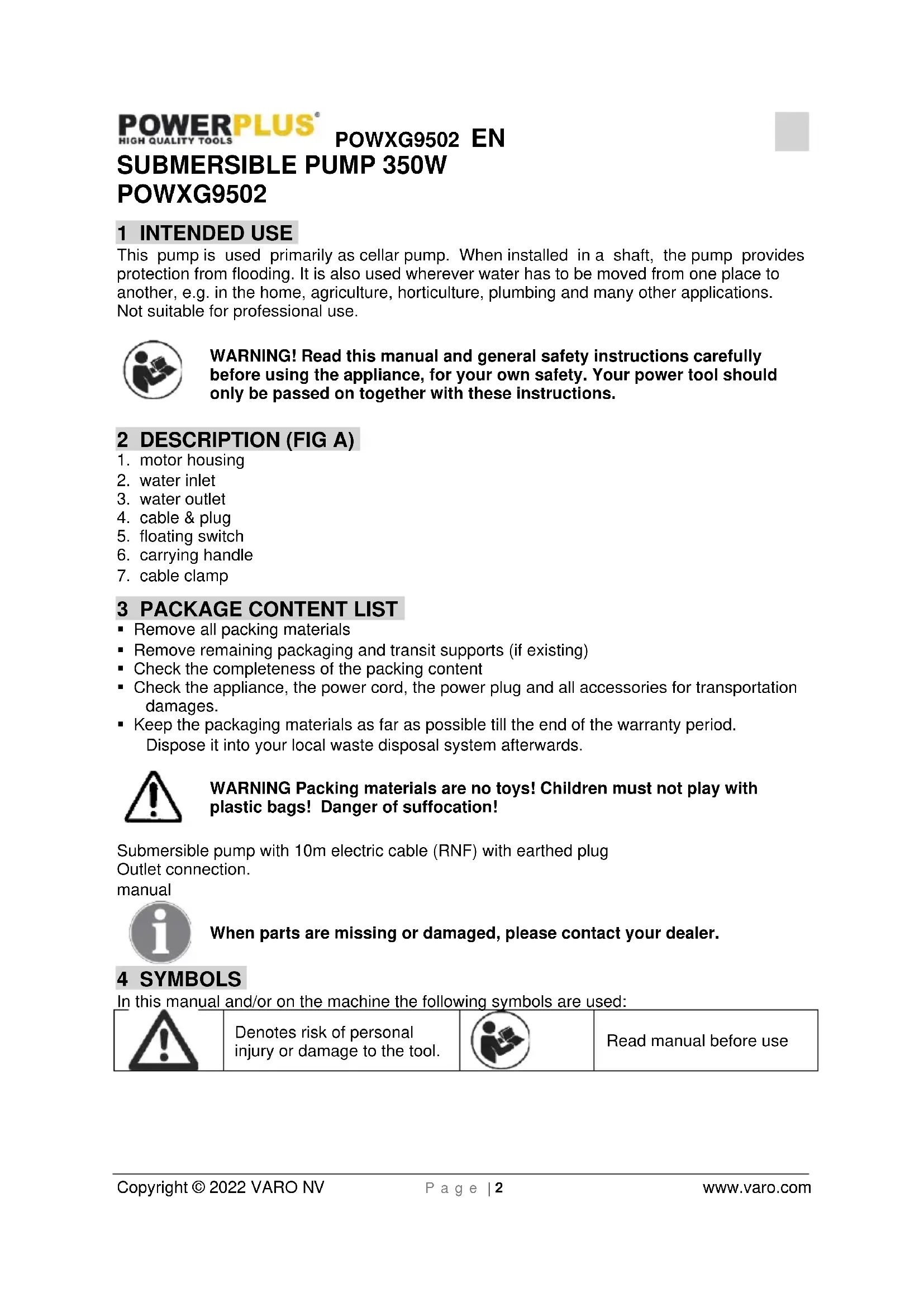 - in a stationary position with a flexible hose pipe. Please note! You should never install the pump by suspending it unsupported from its delivery pipe or power cable. The submersible pump must be suspended from the specially provided handle or be placed on the bottom of the shaft. To guarantee that the pump works properly, the bottom of the shaft must be kept free of sludge and dirt of all kinds. If the level of water sinks too far, any sludge in the shaft will dry out quickly and stop the pump from starting up. ,Therefore it is necessary to check the submersible motor pump regularly (by carrying out start-up tests). The floater is adjusted in a way that the pump can immediately be started Note! The pump shaft should have minimum dimensions of 40 x 40 x 50 cm, so that the floating switch can move freely.POWXG9502 EN Copyright © 2022 VARO NV P a g e | 4 www.varo.com Mains supply Your new submersible pump is equipped with a shock-proof plug according to regulations. The pump is designed to be connected to a 230V - 50 Hz earthed socket. Make sure that the socket is sufficiently secured (min. 6 Amp.) and is in excellent condition. Introduce the plug into the socket and the pump is ready to go. Important Note! If the mains cable or plug suffers any damage from external action, repairs to the cable should be serviced by a qualified specialist using only standard spare parts. This will ensure that it meets the required safety standards.